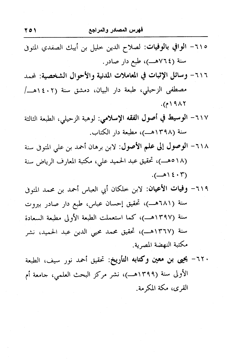 ٦١٦ - وسائل الإثبات في المعاملات المدنية والأحوال الشخصية: لمحمد مصطفى الزحيلي، طبعة دار البيان، دمشق سنة (١٤٠٢ هـ/ ١٩٨٢ م).