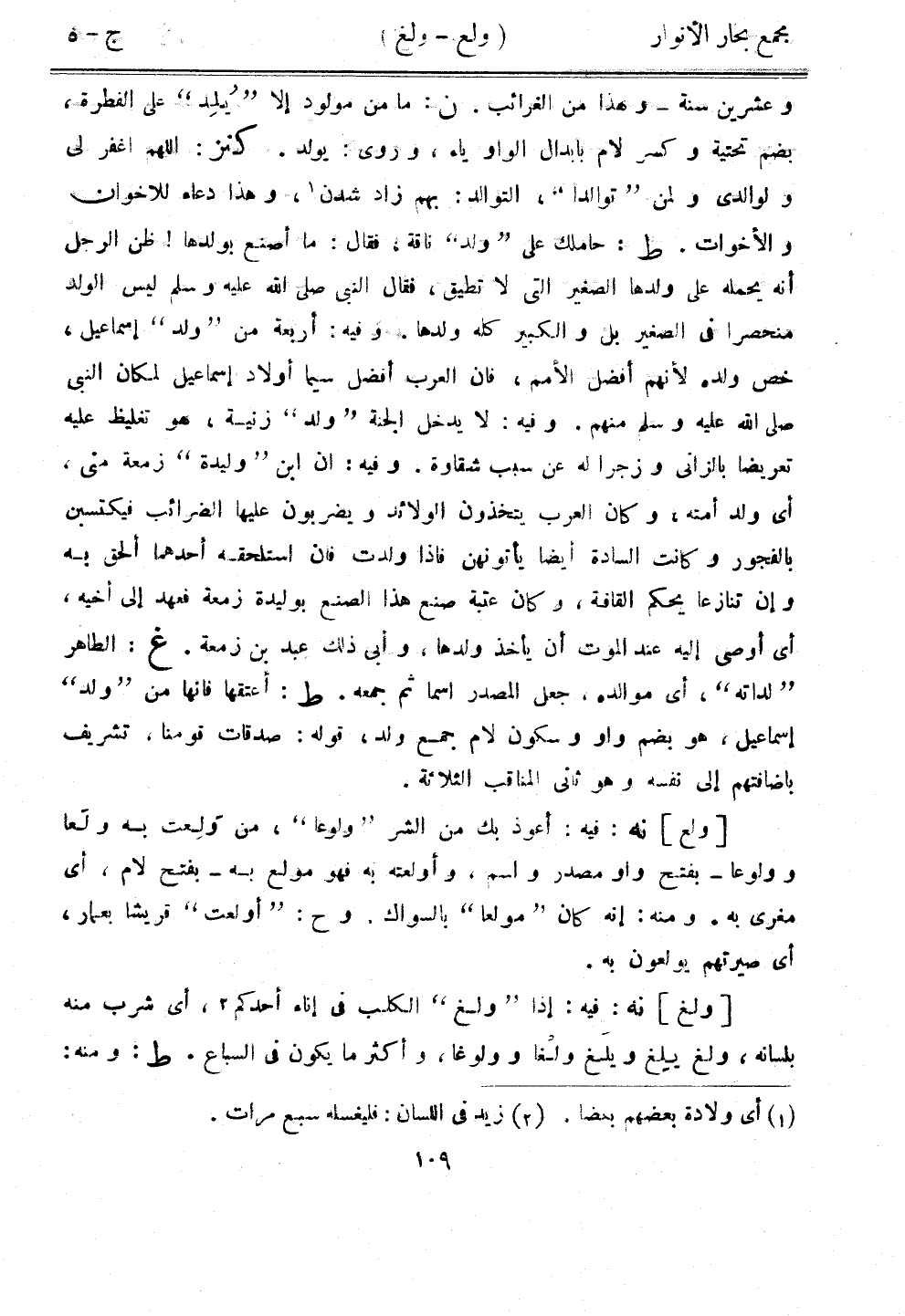 وعشرين سنة - وهذا من الغرائب. ن: ما من مولود إلا "يُلد" على الفطرة، بضم تحتية وكسر لام بإبدال الواو ياء، وروي: يولد. كنز: اللهم اغفر لي ولوالدي ولمن "توالدا"، التوالد: بهم زاد شدن، وهذا دعاء للإخوان والأخوات. ط: حاملك على "ولد" ناقة، فقال: ما أصنع بولدها! ظن الرجل أنه يحمله على ولدها الصغير بل والكبير كله ولدها. وفيه: أربعة من "ولد" إسماعيل، خص ولده لأنهم أفضل الأمم، فإن العرب أفضل سيما أولاد إسماعيل لمكان النبي صلى الله عليه وسلم منهم. وفيه: لا يدخل الجنة "ولد" زنية، هو تغليظ عليه تعريضًا بالزاني وزجرًا له عن سبب شقاوة. وفيه: أن ابن "وليدة" زمعة مني، أي ولد أمتي، وكان العرب يتخذون الولائد ويضربون عليها الضرائب فيكتسبن بالفجور وكانت السادة أيضًا يأتونهن فإذا ولدت فإن استلحقه أحدهما ألحق به وإن تنازعا يحكم القافة، وكان عتبة صنع هذا الصنع بوليدة زمعة فعهد إلى أخيه، أي أوصى إليه عند الموت أن يأخذ ولدها، وأبي ذلك عبد بن زمعة. غ: الطاهر "لداته"، أي موالده، جعل المصدر اسمًا ثم جمعه. ط: أعتقها فإنها من "ولد" إسماعيل، هو بضم واو وسكون لام جمع ولد، قوله: صدقات قومنا، تشريف بإضافتهم إلى نفسه وهو ثاني المناقب الثلاثة.