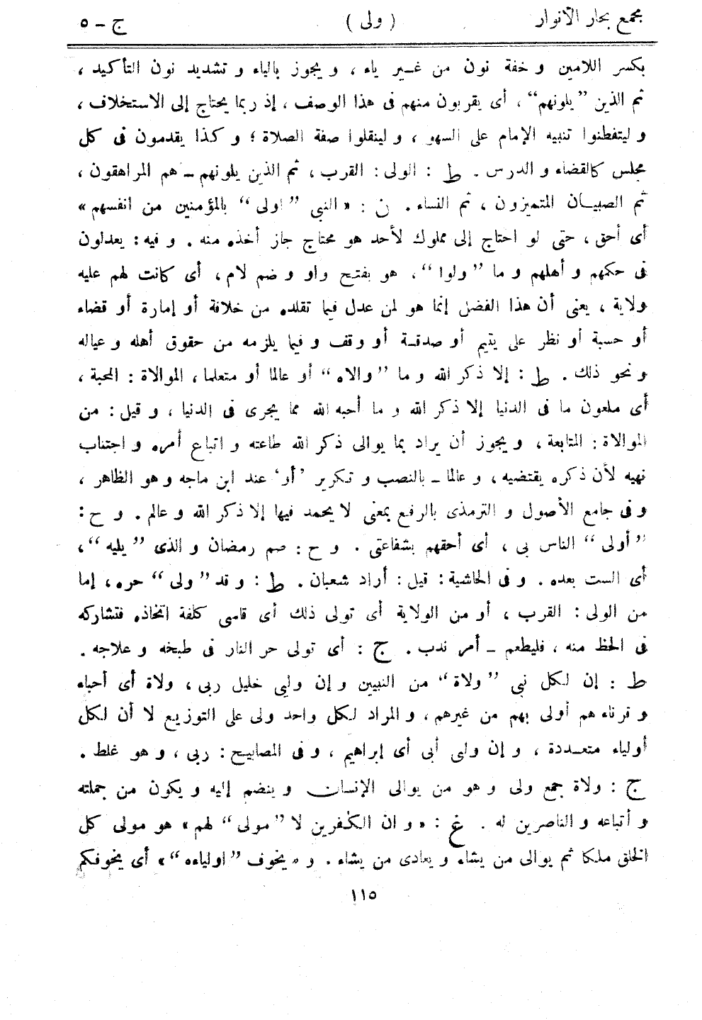 بكسر اللامين وخفة نون من غير ياء، ويجوز بالياء وتشديد نون التأكيد، ثم الذين "يلونهم"، أي يقربون منهم في هذا الوصف، إذ ربما يحتاج إلى الاستخلاف، وليتفطنوا تنبيه الإمام على السهو، ولينقلوا صفة الصلاة، وكذا يقدمون في كل مجلس كالقضاء والدرس. ط: الولي: القرب، ثم الذين يلونهم - هم المراهقون، ثم الصبيان المتميزون، ثم النساء. ن: "النبي"أولى" بالمؤمنين من أنفسهم" أي أحق، حتى لو احتاج إلى مملوك لحد هو محتاج جاز أخذه منه. وفيه: يعدلون في حكمهم وأهلهم وما "ولوا"، هو بفتح واو وضم لام، أي كانت لهم عليه ولاية، يعني أن هذا الفضل إنما هو لمن عدل فيما تقلده من خلافة أو إمارة أو قضاء او حسبة أو نظر على يتيم أو صدقة أو وقف فيما يلزمه من حقوق أهله وعياله ونحو ذلك. ط: إلا ذكر الله وما "والاه" أو عالمًا أو متعلمًا، الموالاة: المحبة، أي ملعون ما في الدنيا إلا ذكر الله وما أحبه الله مما يجري في الدنيا، وقيل: من الموالاة: المتابعة، ويجوز أن يراد بما يوالي ذكر الله طاعته واتباع أمره واجتناب نهيه لأن ذكره يقتضيه، وعالمًا - بالنصب وتكرير "أو" عند ابن ماجه وهو الظاهر، وفي جامع الأصول والترمذي بالرفع بمعنى لا يحمد فيها إلا ذكر الله وعالم. وح: "أولى" الناس بي، أي أحقهم بشفاعتي. وح: صم رمضان والذي "يليه"، أي الست بعده. وفي الحاشية: قيل: أراد شعبان. ط: وقد "ولى" حره، إما من الولي: القرب، أو من الولاية أي تولى ذلك أي قاسى كلفة اتخاذه فتشاركه في الحظ منه، فليطعم - أمر ندب. ج: أي تولى حر الناس في طبخه وعلاجه. ط: إن لكل نبي "ولاة" من النبيين وإن وليي خليل ربي، ولاة أي أحباء وقرناءهم أولى بهم من غيرهم، والمراد لكل واحد ولى على التوزيع لا أن لكل أولياء متعددة، وإن وليي أبي أي إبراهيم، وفي المصابيح: ربي، وهو غلط. ج: ولاة جمع ولى وهو من يوالي الإنسان وينضم إليه ويكون من جملته وأتباعه والناصرين له. غ: "وأن الكافرين لا "مولى" لهم" هو مولى كل الخلق ملًا ثم يوالي من يشاء ويعادي من يشاء. و"يخوف "أولياء"" أي يخوفكم