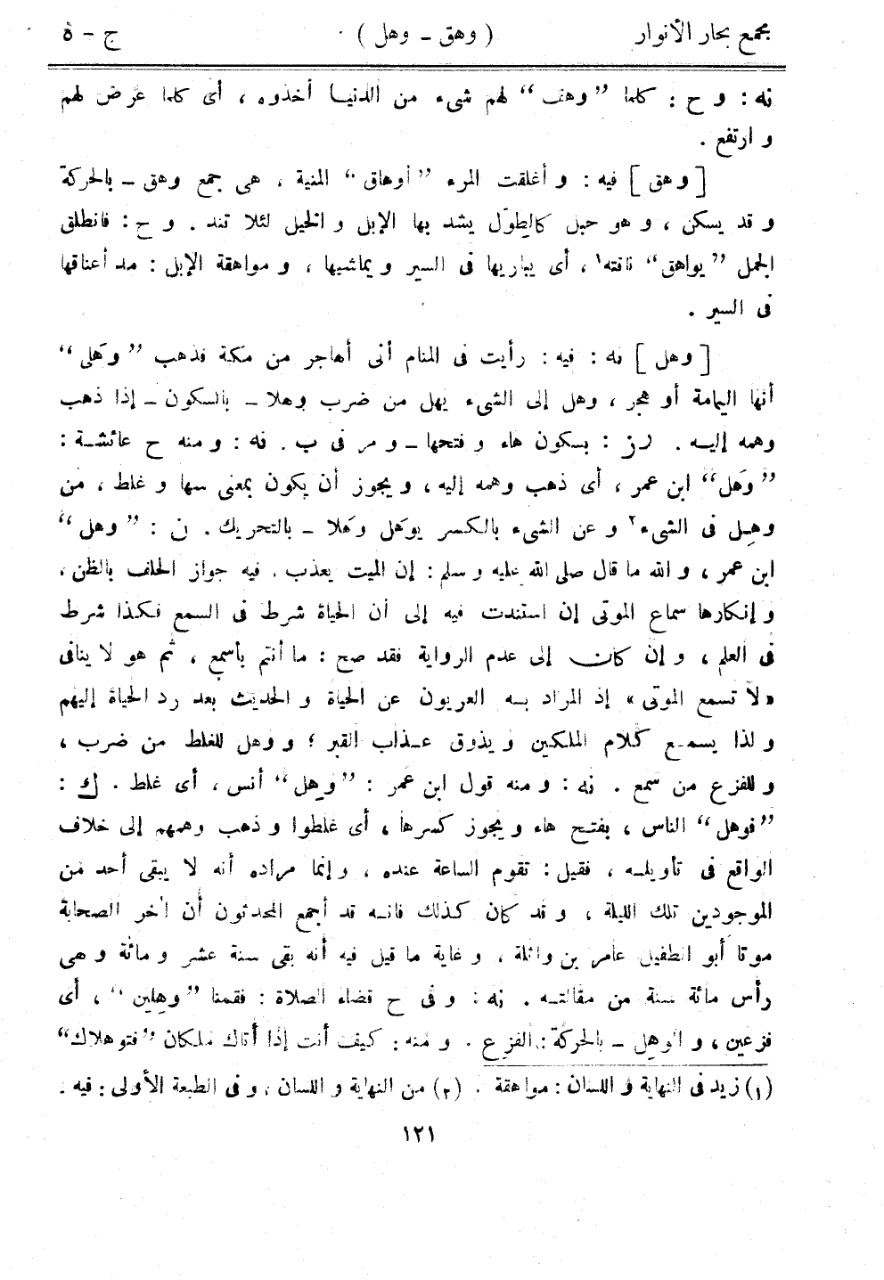 [وهل] نه: فيه: رأيت في المنام أني أهاجر من مكة فذهب "وهلى" أنها اليمامة أو هجر، وهل إلى الشيء يهل من ضرب وهلا - بالسكون - إذا ذهب وهمه إليه. رز: بسكون هاء وفتحها - ومر في ب. نه: ومنه ح عائشة: "وهل" ابن عمر، أي ذهب وهمه إليه، ويجوز أن يكون بمعنى سها وغلطن من وهل في الشيء وعن الشيء بالكسر يوهل وهلا - بالتحريك. ن:"وهل" ابن عمرن والله ما قال صلى الله عليه وسلم: إن الميت يعذب، فيه جواز الحلف بالظن، وإنكارها سماع الموتى إن استندت فيه إلى أن الحياة شرط في السمع فكذا شرط في اللم، وإن كان إلى عدم الرواية فقد صح ما أنتم بأسمع، ثم هو لا ينافي "لا تسمع الموتى" إذ المراد به العريون عن الحياة والحديث بعد رد الحياة إليهم ولذا يسمع كلام الملكين ويذوق عذاب القبر، ووهل للغلط من ضرب، وللفزع من سمع. نه: ومنه قول ابن عمر: "وهل" انس، أي غلط. ك: "فوهل" الناس، بفتح هاء ويجوز كسرها، أي غلطوا وذهب وهمهم إلى خلاف الواقع في تأويله، فقيل: تقوم الساعة عنده، وإنما مراده أنه لا يبقى أحد من الموجودين تلك الليلة، وقد كان كذلك فإنه قد أجمع المحدثون أن آخر الصحابة موتًا أبو الطفيل عامر بن واثلة، وغاية ما قيل فيه أنه بقى سنة عشر ومائة وهي رأس مائة سنة من مقالته. نه: وفي ح قضاء الصلاة: فقمنا "وهلين"، أي فزعين، والوهل -بالحركة: الفزع. ومنه: يف أنت إذا أتاك ملكان "فتوهلاك"