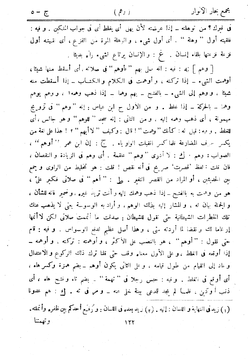 [وهم] نه: فيه: أنه صلى بهم "فأوهم" في صلاته، أي أسقط منها شيئًا، أوهمت الشيء - بالفتح - بهم وهما- إذا ذهب وهمه، ووهم يوهم وهما - بالحركة - إذا غلط. ومن الأول ح ابن عباس: إنه "وهم" في تزويج ميمونة، أي ذهب وهمه غليه، ومن الثاني: إنه سجد "للوهم" وهو جالس، أي للغلط. وفيه: قيل له: كأنك "وهمت"! قال: وكيف "لا أيهم"! هذا على لغة من يكسر حرف المضارعة فلما كسر انقلبت الواو ياء. ج: إن ابن عمر "أوهم"، الصواب: وهم. ك: لا أدري "وهم" علقمة، أي وهم في الزيادة والنقصان، فإن قلت: لفظ "قصرت" صريح في أنه نقص! قلت: هو تخليط من الراوي وجمع بين الحديثين، أو المراد من القصر التغير، ط: "أهم" في صلاتي فكبر عليّ، هو من وهمت به بالفتح - إذا ذهب وهمك إليه وأنت تريد غيره، وضمير فنه للشأن، والجملة بيان له، والمشار إليه بذلك الوهم، وأراد به الوسوسة يعني لا يذهب عنك تلك الخطرات الشيطانية حتى تقول للشيطان: صدقت ما أتممت صلاتي لكن لا أتمها إرغامًا لك ونقضًا لما أردته مني، وهذا أصل عظيم لدفع الوسواس. وفيه: قام حتى نقول: "أوهم"، هو بالنصب على الأكثر، وأوهمته: تركته، وأوهمه - إذا أوقعه في الغلط، وعلى الأول معناه وقف حتى قلنا ترك ذلك الركوع والاعتدال وعاد إلى القيام من طول قيامه، وعلى الثاني يكون أوهم - بضم همزة وكسر هاء، أي أوقع في الغلط. وفيه: حبس رجلًا في "تهمة" - بضم تاء وفتح هاء، أي ذنب أو دين، فلما لم يجد للمدعي بينة خلى عنه - ومر في ته. ك: هم عدونا