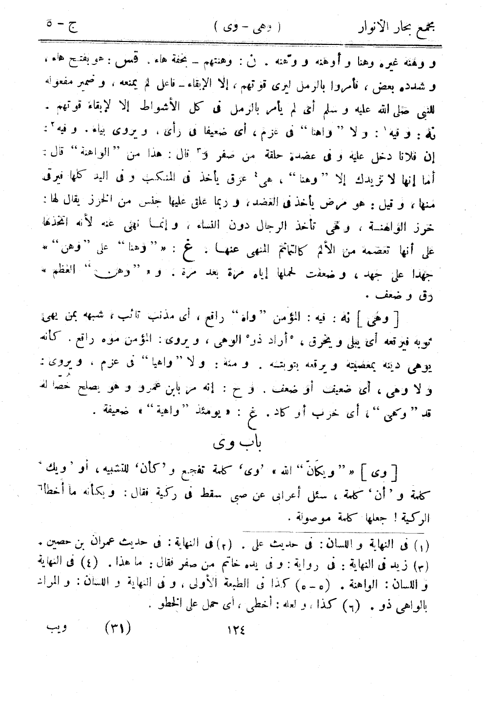 ووهنه غيره وهنًا وأوهنه ووهنه. ن: وهنتهم - بخفة هاء. قس: هو بفتح هاء، وشدده بعض، فأمروا بالرمل ليرى قوتهم، إلا الإبقاء -فاعل لم يمنعه، وضمير مفعوله للنبي صلى الله عليه وسلم أي لم يأمر بالرمل في كل الأشواط إلا لإبقاء قوتهم. نه: وفيه: ولا "واهنا" في عزم، أي ضعيفًا في رأي، ويروى بياء. وفيه: إن فلانًا دخل عيه وفي عضده حلقة من صفر وقال: هذا من "الواهنة" قال: أما إنها لا تزيدك إلا "وهنا"، هي عرق يأخذ في المنكب وفي اليد كلها فيرقى منها، وقيل: هو مرض يأخذ في العضد، وربما علق عليها جنس من الخرز يقال لها: خرز الواهنة، وهي تأخذ الرجال دون النساء، وإنما نهى عنه لأنه اتخذها على أنها تعصمه من الألم التمائم المنهي عنها. غ: "وهنا" على "وهن"" جهدًا على جهد، وضعفت لحملها إياه مرة بعد مرة. و""وهن" العظم" رق وضعف.