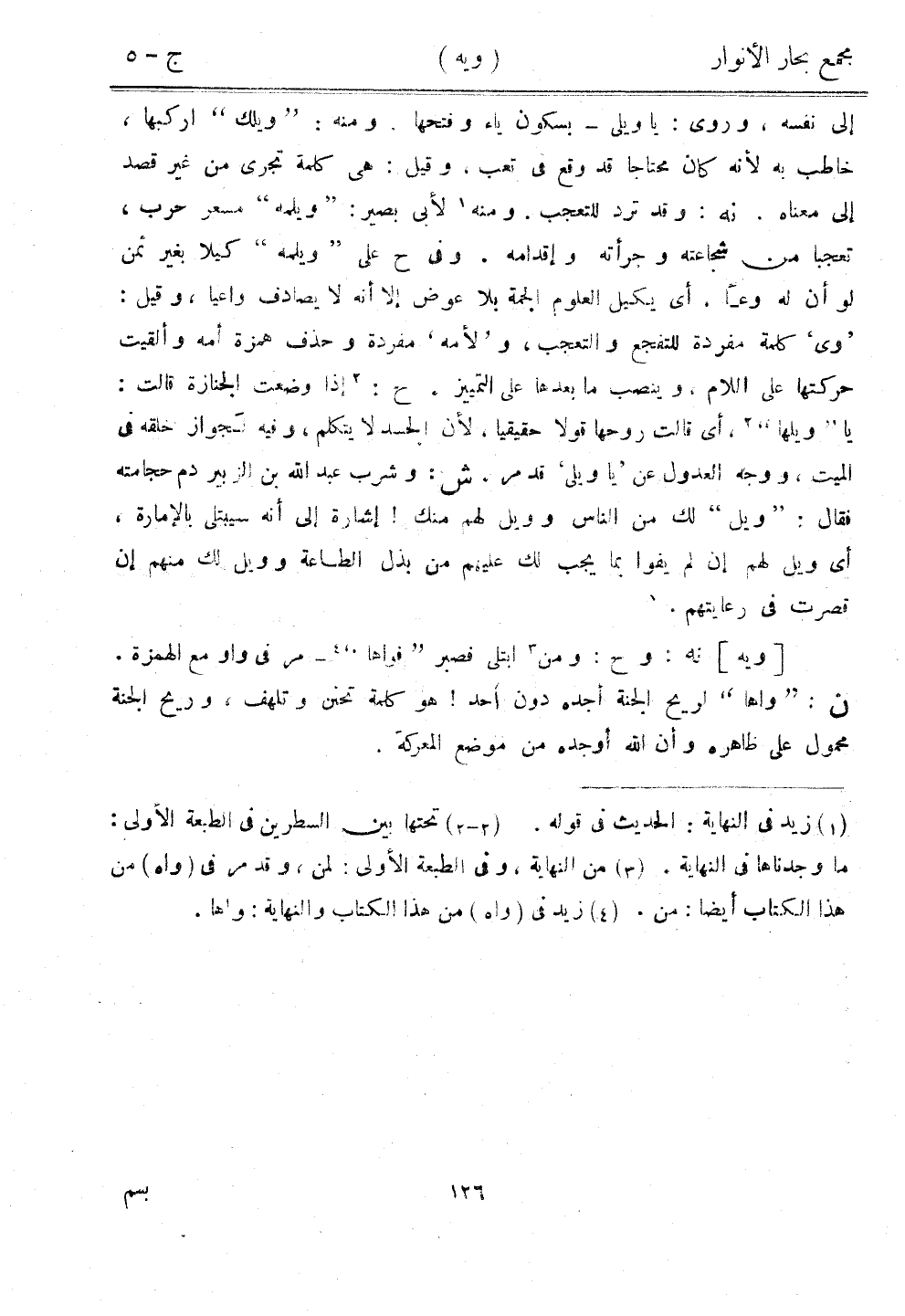 إلى نفسه، وروي: يا ويلي - بسكون ياء وفتحها. ومنه: "ويلك" اركبها، خاطب به لأنه كان محتاجًا قد وقع في تعب، وقيل: هي كلمة تجري من غير قصد إلى معناه. نه: وقد ترد للتعجب. ومنه لأبي بصير: "ويلمه" مسعر حرب، تعجبًا من شجاعته وجرأته وإقدامه. وفي ح على "ويلمه" كيلا بغير ثمن لو أن له وعيًا. أي يكيل العلوم الجمة بلا عوض إلا أنه لا يصادف واعيًان وقيل:"وى" كلمة مفردة للتفجع والتعجب، و"لأمه" مفردة وحذف همزة أمه وألقيت حركتها على اللام، وينصب ما بعدها على التمييز. ح: إذا وضعت الجنازة قالت: يا "ويلها"، أي قالت روحها قولًا حقيقيا، لأن الجسد لا يتكلم، وفيه لجواز خلقه في الميت، ووجه العدول عن "يا ويلي" قد مر. ش: وشرب عبد الله بن الزبير دم حجامته فقال: "ويل" لك من الناس وويل لهم منك! إشارة إلى أنه سيبتلى بالإمارة، أي ويل لهم إن لم يفوا بما يجب لك عليهم من بذل الطاعة وويل لك منهم إن قصرت في رعايتهم.