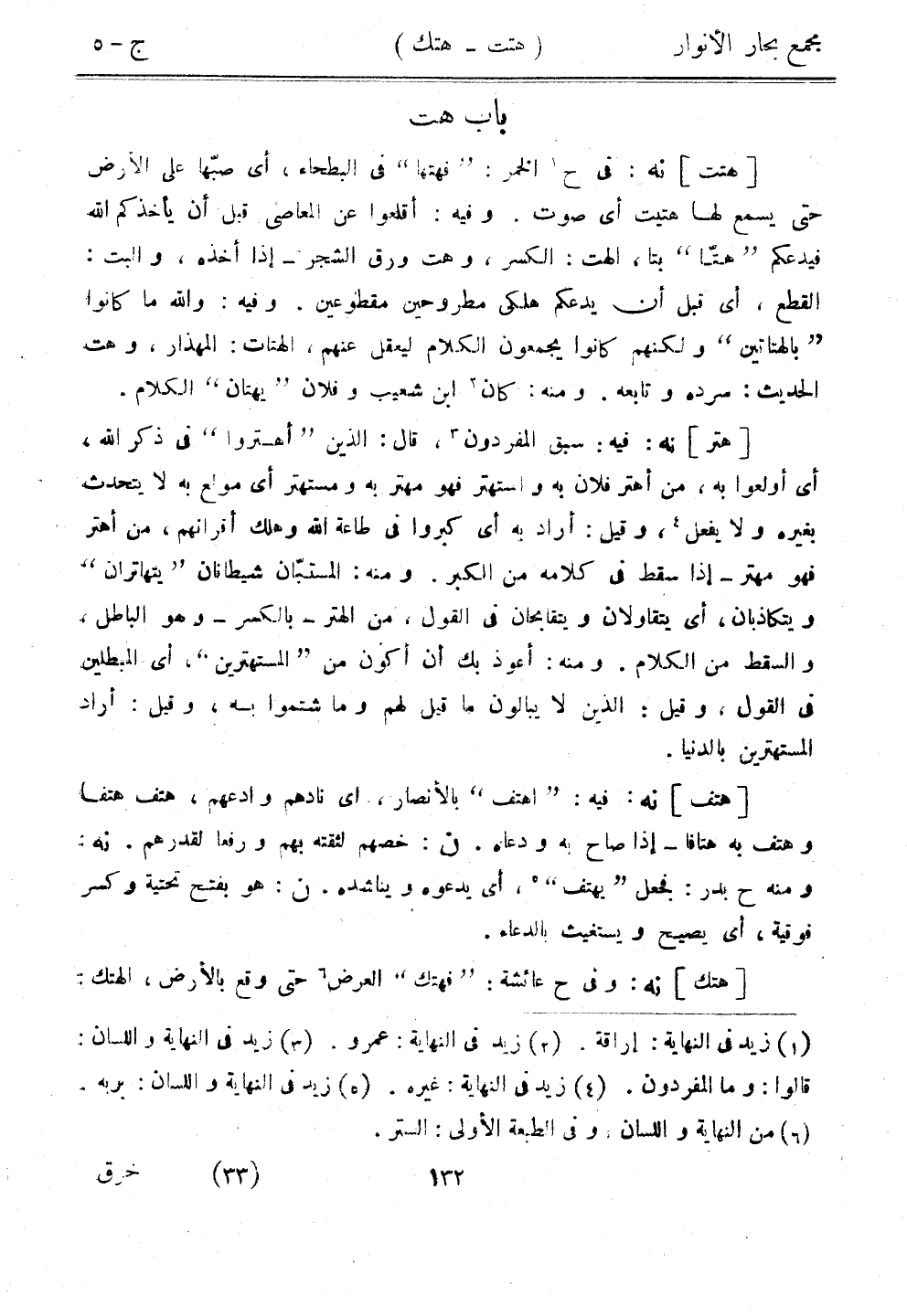 [هتت] نه: ي ح الخمر: "فهتها" في البطحاء، أي صبها على الأرض حتى يسمع لها هتيت أي صوت. وفيه: أقلعوا عن المعاصي قبل أن يأخذكم الله فيدعكم "هتا" بتا، الهت: الكسر، وهت ورق الشجر - إذا أخذه، والبت: القطع، أي قبل أن يدعكم هلكي مطروحين مقطوعين. وفيه: والله ما كانوا "بالهتاتين" ولكنهم كانوا يجمعون الكلام ليعقل عنهم، الهتات: المهذار، وهت الحديث: سرده وتابعه. ومنه: كان ابن شعيب وفلان "يهتان" الكلام.