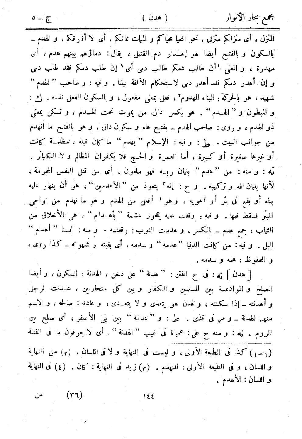 المنزل، أي منزلكم منزلين نحو المحيا محياكم والممات مماتكم، أي لا أفارقكم، والهدم- بالسكون وبالفتح أيضًا هو إهدار دم القتيل، يقال: دماؤهم بينهم هدم، أي مهدرة، والمعنى أن طالب دمكم طالب دمي أي إن طلب دمكم فقد طلب دمي وإن أهدر دمكم فقد أهدر دمي لاستحكام الألفة بيننا. وفيه: وصاحب "الهدم" شهيد، هو بالحركة: البناء المهدوم، فعل بمعنى مفعول، وبالسكون الفعل نفسه. ك: والمبطون و"الهدم"، هو بكسر دال من يموت تحت الهدم، وتسكن بمعنى ذو الهدم، وروي: صاحب الهدم - بفتح هاء وسكون دال، وهو بالفتح ما انهدم من جوانب البيت. ط: وفيه: الإسلام "يهدم" ما كان قبله، مظلمة كانت أغيرها صغيرة أو كبيرة، أما العمرة والحج فلا يكفران المظالم ولا الكبائر. نه: ومنه: من "هدم" بنيان ربه فهو ملعون، أي من قتل النفس المحرمة، لأنها بنيان الله وتركيبه. وح: إنه يتعوذ من "الأهدمين"، هو أن ينهار عليه بناء أويقع في بئر أو أهوية، وهو أفعل من الهدم وهو ما تهدم من نواحي البئر فسقط فيها. وفيه: وقفت عليه عجوز عشمة "بأهدام"، هي الأخلاق من الثياب، جمع هدم - بالكسر، وهدمت الثوب: رقعته. ومنه" لبسنا "أدام" البلى. وفيه: من كانت الدنيا "هدمه" وسدمه، أي بغيته وشهوته - كذا روى، والمحفوظ: همه وسدمه.