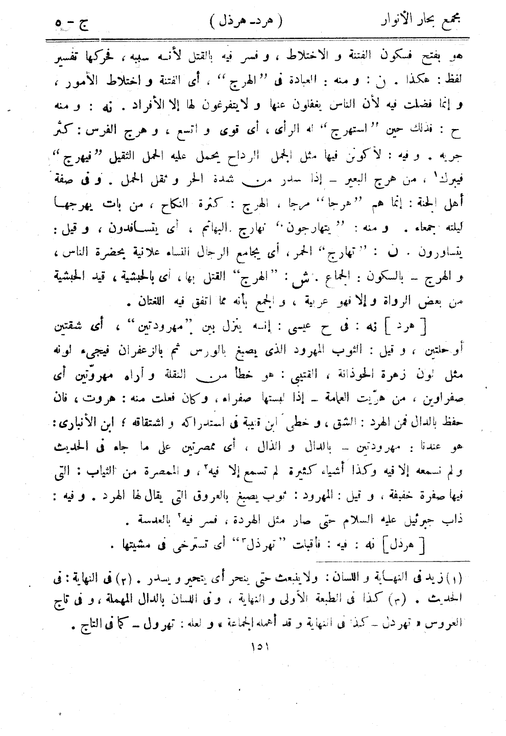 هو بفتح فسكون الفتنة والاختلاط، وفسر فيه بالقتل لأنه سببه، فحركها تفسير لفظ: هكذا. ن: ومنه: العبادة في "الهرج"، أي الفتنة واختلاط الأمور، وإنما فضلت فيه لأن الناس يغفلون عنها ولا يتفرغون لها إلا الأفراد. نه: ومنه ح: فذلك حين "استهرج" له الرأي، أي قوى واتسع، وهرج الفرس: كثر جريه. وفيه: لأكونن فيها مثل الجمل الرداح يحمل عليه الحمل الثقيل "فيهرج" فيبرك، من هرج البعير - إذا سدر من شدة الحر وثقل الحمل. وفي صفة أهل الجنة: إنما هم "هرجا" مرجا، الهرج: كثرة النكاح، من بات يهرجها ليلته جمعاء. ومنه: "يتهارجون" نهارج البهائم، أي يتسافدون، وقيل: يتساورون. ن: "تهارج" الحمر، أي يجامع الرجال النساء علانية بحضرة الناس، والهرج - بالسكون: الجماع. ش: "الهرج" القتل بها، أي بالحبشية، قيد الحبشية من بعض الرواة وإلا فهو عربية، والجمع بأنه مما اتفق فيه اللغتان.