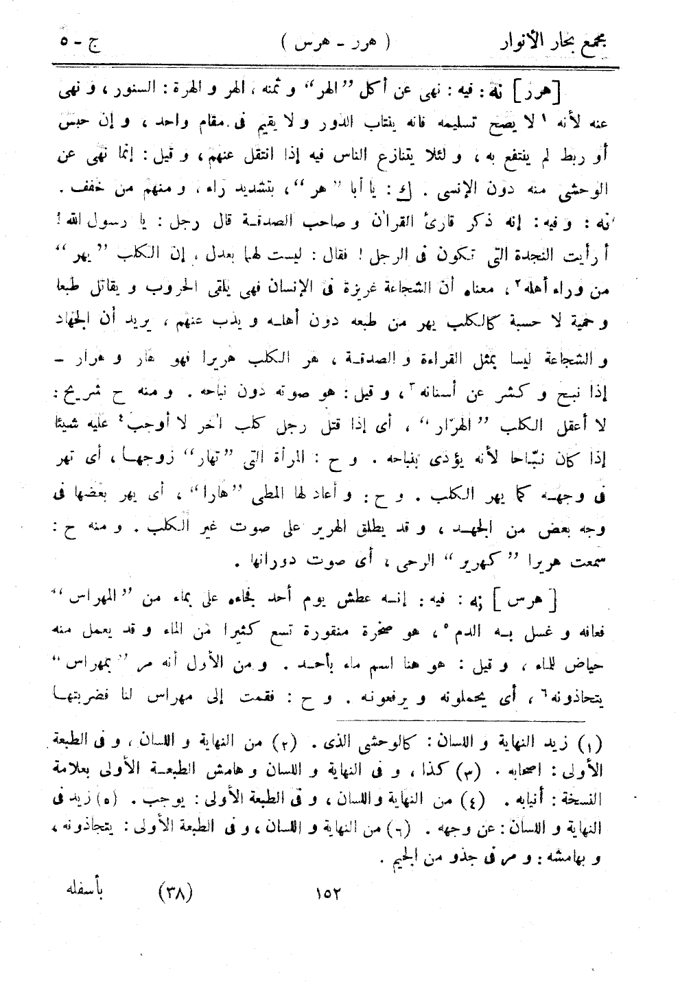 [هرر] نه: فيه: نهى عن أكل "الهر" وثمنه، الهر والهرة: السنور، ونهى عنه لأنه لا يصح تسليمه فإنه ينتاب الدور ولا يقيم في مقام واحد، وإن حبس أو ربط لم ينتفع به، ولئلا يتنازع الناس فيه إذا انتقل عنهمن وقيل: إنما نهى عن الوحشي منه دون الإنسي. ك: يا أبا "هر"، بتشديد راء، ومنهم من خفف. نه: وفيه: إنه ذكر قارئ القرآن وصاحب الصدقة قال رجل: يا رسول الله! أرأيت النجدة التي تكون في الرجل! فقال: ليست لهما بعدل، إن الكلب "يهر" من وراء أهله، معناه أن الشجاعة غريزة في الإنسان فهي يلقى الحروب ويقاتل طبعًا وحمية لا حسبة كالكلب يهر من طبعه دون أهله ويذب عنهم، يريد أن الجهاد والشجاعة ليسا بمثل القراءة والصدقة، هر الكلب هريرا فهو هار وهرار - إذا نبح وكشر عن أسنانه، وقيل: هو صوته دون نباحه. ومنه ح شريح: لا أعقل الكلب "الهرار"، أي إذا قتل رجل كلب آخر لا أوجب عليه شيئًا إذا كان نباحًا لأنه يؤذي بنباحه. وح: المرأة التي "تهار" زوجها، أي تهر في وجهه كما يهر الكلب. وح: وأعاد لها المطي "هارا"، أي يهر بعضها في وجه بعض من الجهد، وقد يطلق الهرير على صوت غير الكلب. ومنه ح: سمعت هريرًا "كهرير" الرحى، أي صوت دورانها.
