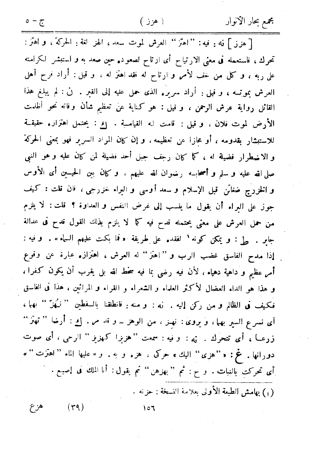 [هزز] نه: فيه: "اهتز" العرش لموت سعد، الهز لغة: الحركة، واهتز: تحرك، فاستعمله في معنى الارتياح أي ارتاح لصعوده حين صعد به واستبشر لكرامته على ربه، وكل من خف لأمر وارتاح له فقد اهتز له، وقيل: أراد فرح أهل العرش بموته، وقيل: أراد سريره الذي حمل عليه إلى القبر. ن: لم يبلغ هذا القائل رواية عرش الرحمن، وقيل: هو كناية عن تعظيم شأن وفاته نحو أظلمت الأرض لموت فلان، وقيل: قامت له القيامة. ك: يحتمل اهتزازه حقيقة للاستبشار بقدومه، أو مجازًا عن تعظيمه، وإن كان المراد السرير فهو بمعنى الحركة والاضطرار فضيلة لهن كما كان رجف جبل أحد فضيلة لمن كان عليه وهو النبي صلى الله عليه وسلم وأصحابه رضوان الله عليهم، وكان بين الحيين أي الأوس والخزرج ضغائن قبل الإسلام وسعد أوسى والبراء خزرجي، فإن قلت: كيف جوز على البراء أن يقول ما ينسب إلى غرض النفس والعداوة؟ قلت: لا يلزم من حمل العرش على معنى يحتمله قدح فيه كما لا يلزم بذلك القول قدح في عدالة جابر. ط: ويمكن كونه لفقده على طريقة "فما بكت عليهم السماء". وفيه: إذا مدح الفاسق غضب الرب و"اهتز" له العرش، اهتزازه عبارة عن وقوع أمر عظيم وداهية دهياء، لأن فيه رضي بما فيه سخط الله بل يقرب أن يكون كفراص، وهذا هوا لداء العضال لأكثر العلماء والشعراء والقراء والمرائين، هذا في الفاسق فكيف في الظالم ومن ركن إليه. نه: ومنه: فانطلقنا بالسفطين "نُهز" بهما، أي نسرع السير بهما، ويروى: نهز، من الوهز - وقد مر. ك: أرضًا "تهتز" زرعًا، أي تتحرك. نه: وفيه: سمعت "هزيزًا كهزيز" الرحى، أي صوت دورانها. غ: ""هزى" إليك" حركي، هزه وبه. و"عليها الماء "اهتزت"" أي تحركت بالنبات. وح: "يهزهن" ثم يقول: أنا الملك في إصبع.