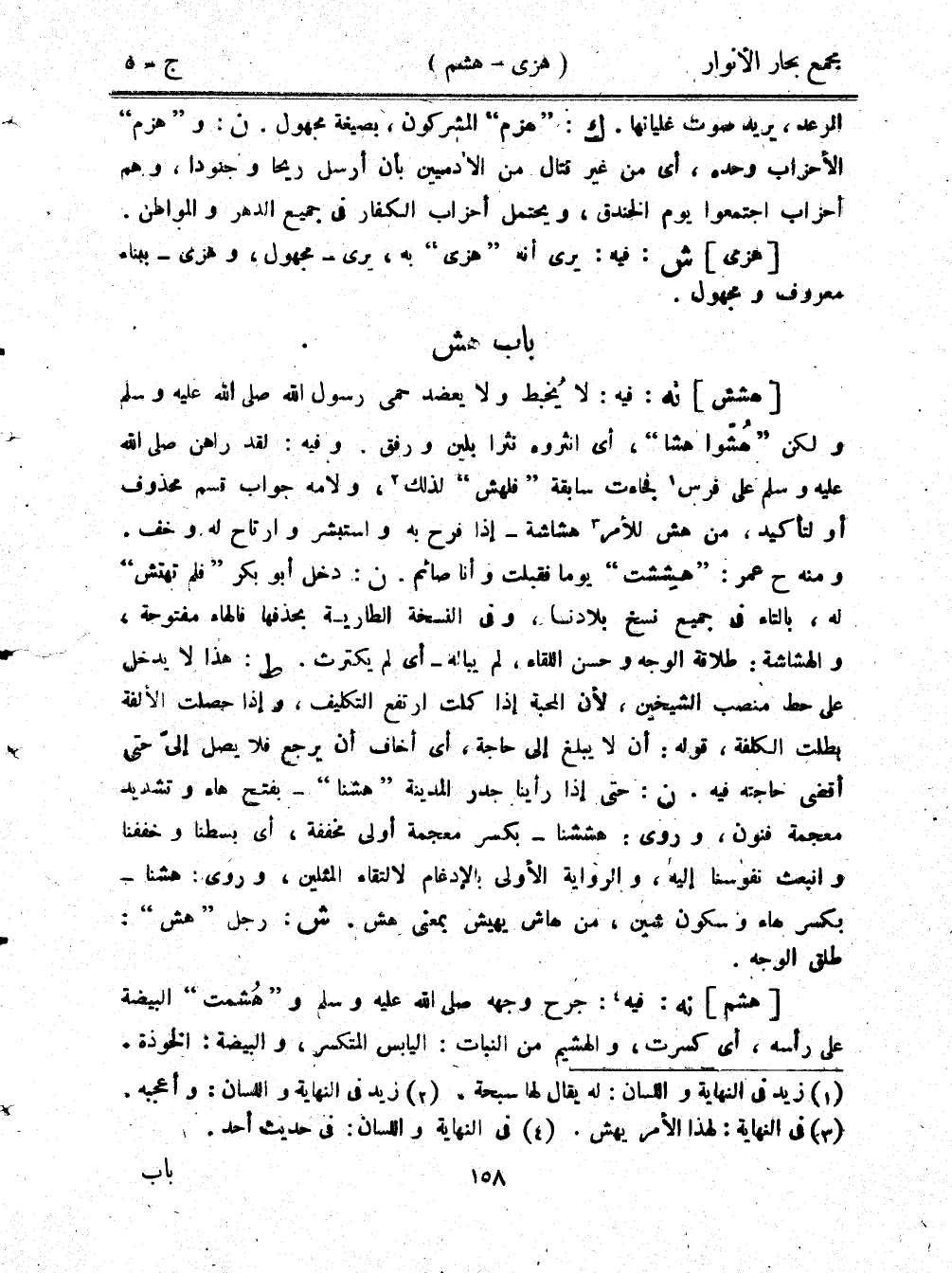 [هشش] نه: فيه: لا يُخبط ولا يعضد حمى رسول الله صلى الله عليه وسلم ولكن "هشوا هشا"، أي انثروه نثرا بلين ورفق. وفيه: لقد راهن صلى الله عليه وسلم على فرس فجاءت سابقة "فلهش" لذلك، ولامه جواب قسم محذوف أو لتأكيد، من هش للأمر هشاشة - إذا فرح به واستبشر وارتاح له وخف. ومنه ح عمر: "هششت" يومًا فقلبت وأنا صائم. ن: دخل أبو بكر "فلم تهتش" له، بالتاء في جميع نسخ بلادنا، وفي النسخة الطارية بحذفها فالهاء مفتوحة، والهشاشة: طلاقة الوجه وحسن اللقاء، لم يباله - أي لم يكترث. ط: هذا لا يدخل على حط منصب الشيخين، لأن المحبة إذا كملت ارتفع التكليف، وإذا حصلت الألفة بطلت الكلفة، قوله: أن لا يبلغ إلى حاجة، أي أخاف أن يرجع فلا يصل إليّ حتى أقضي حاجته فيه. ن: حتى إذا رأينا جدر المدينة "هشنا" - بفتح هاء وتشديد معجمة فنون، وروي: هششنا - بكسر معجمة أولى مخففة، أي بسطنا وخففنا وانبعث نفوسنا إليه، والرواية الأولى بالإدغام لالتقاء المثلين، وروي: هشنا - بكسر هاء وسكون شين، من هاش يهيش بمعنى هش. ش: رجل "هش": طلق الوجه.