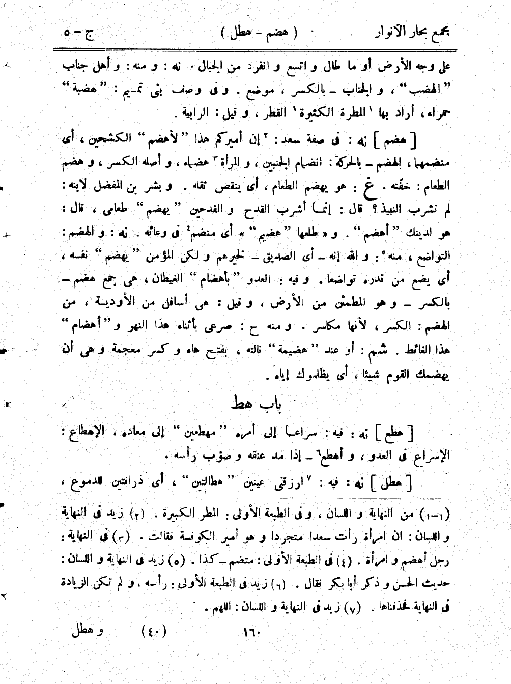 [هضم] نه: في صفة سعد: إن أميركم هذا "لأهضم" الكشحينن أي منضمهما، الهضم - بالحركة: انضمام الجنبين، والمرأة هضماء، وأصله الكسر، وهضم الطعام: خفته. غ: هو يهضم الطعام، أي ينقص ثقله. وبشر بن المفضل لابنه: لم ترب النبيذ؟ قال: إنما أشرب القدح والقدحين "يضهم" طعامي، قال: هو لدينك "أهضم". و"طلعها "هضيم"" أي منضم في وعائه. نه: والهضم: التواضع، منه الله إنه - أي الصديق- لخبرهم ولكن المؤمن "يهضم" نفسه، أي يضع من قدره تواضعا. وفيه: العدو "بأضهام" الغيطان، هي جمع هضم - بالكسر - وهو المطمئن من الأرض، وقيل: هي أسافل من الأودية، من الهضم: الكسر، لأنها مكاسر. ومنه ح: صرعى بأثناء هذا النهر و"أهضام" هذا الغائط. شم: أو عند "هضيمة" نالته، بفتح هاء وكسر معجمة وهي أن يهضمك القوم شيئًا، أي يظلموك إياه.