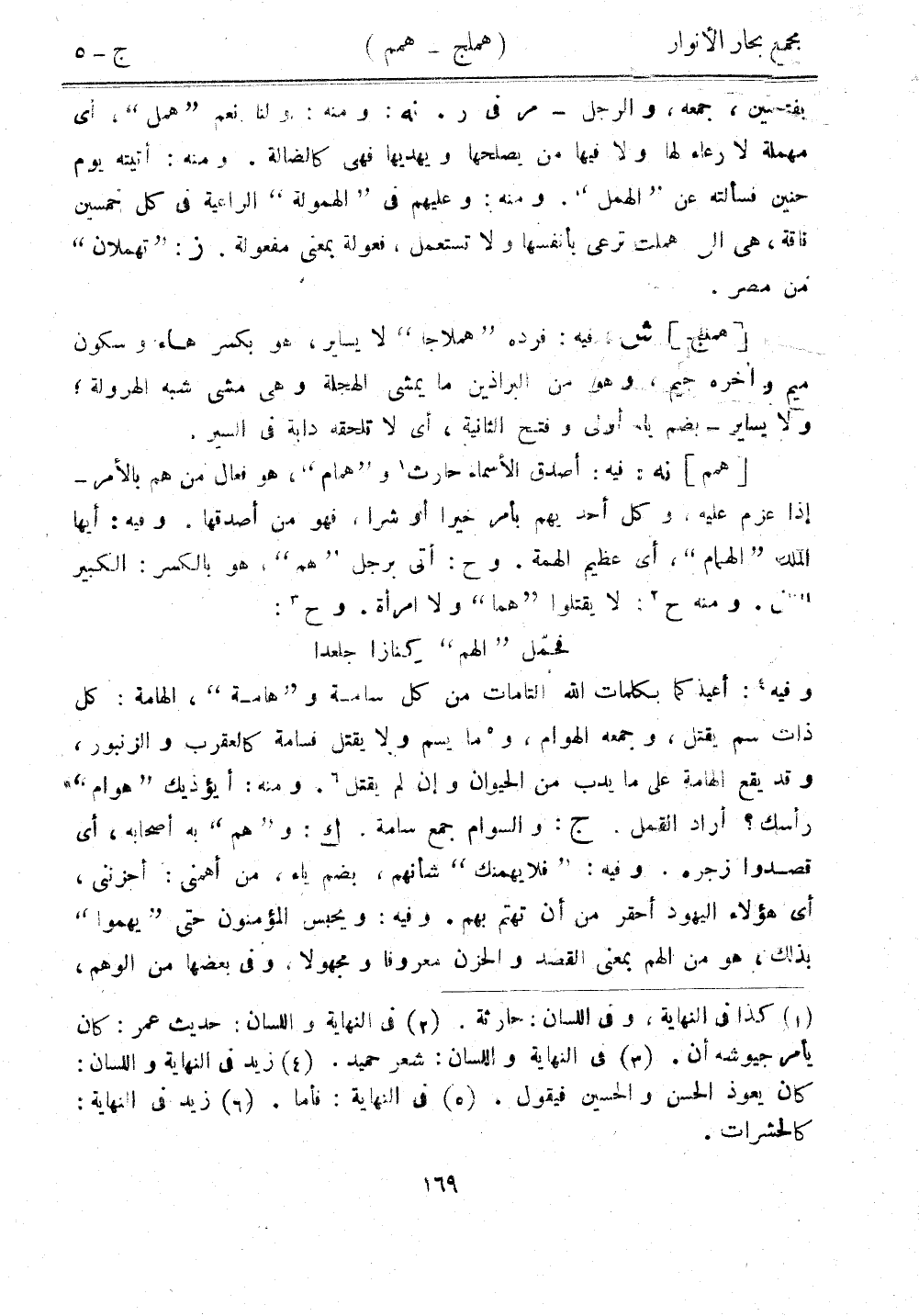 وفيه: أعيذكما بكلمات الله التامات من كل سامة و"هامة"، الهامة: كل ذات سم يقتل، وجمعه الهوام، ومايسم ولا يقتل فسامة كالعقرب والزنبور، وقد يقع الهامة على ما يدب من الحيوان وإن لم يقتل. ومنه: أيؤذيك "هوام" رأسك؟ أراد القمل. ج والسوام جمع سامة. ك: و"هم" به أصحابه، أي قصدوا زجره. وفيه: "فلا يهمنك" شأنهم، بضم ياء، من أهمني: أحزنني، أي هؤلاء اليهود أحقر من أن تهتم بهم. وفيه: ويحبس المؤمنون حتى "يهموا" بذلك، هو من الهم بمعنى القصد والحزن معروفًا ومجهولًان وفي بعضها من الوهم،