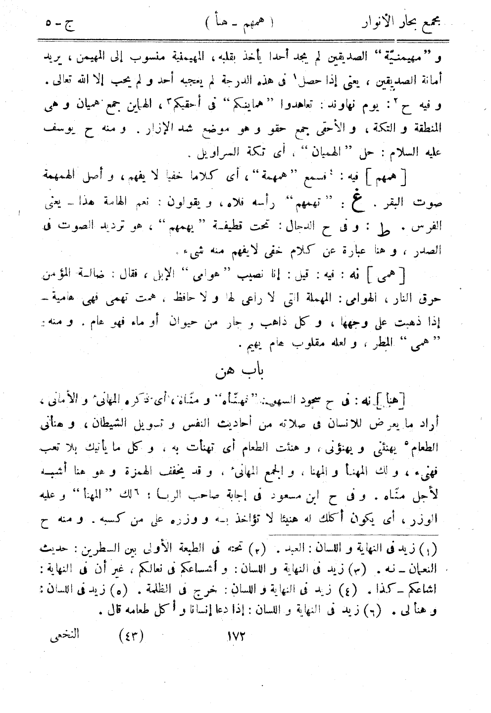 [همهم] فيه: فسمع "همهمة"، أي كلاما خفيًا لا يفهم، وأصل الهمهمة صوت البقر. غ: "تهمهم" رأسه فلاهن ويقولون: نعم الهامة هذا - يعني الفرس. ط: وفي ح الدجال: تحت قطيفة "يهمهم"، هو ترديد الصوت في الصدر، وهنا عبارة عن كلام خفي لا يفهم منه شيء.