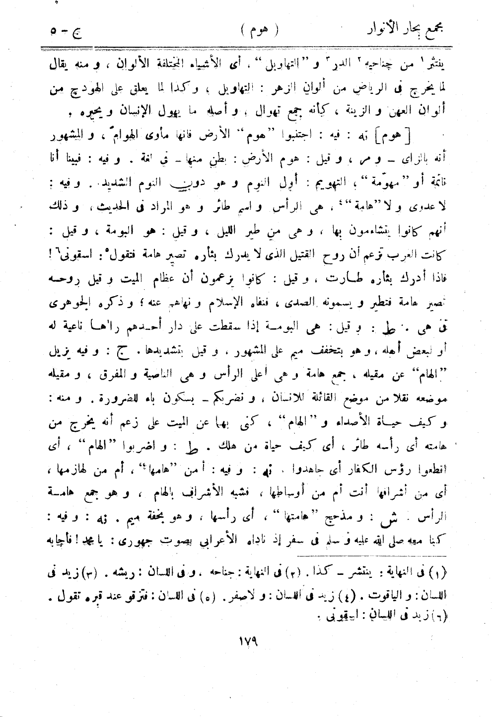 [هوم] نه: فيه: اجتنبوا "هوم" الأرض فنها مأوى الهوام، والمشهور أنه بالزاي - ومر، وقيل: هوم الأرض: بطن منها - في لغة. وفيه: فبينا أنا نائمة أو "مهومة"، التهويم: أول النوم وهو دون النوم الشديد. وفيه: لاعدوى ولا "هامة"، هي الرأس واسم طائر وهو المراد في الحديث، وذلك أنهم كانوا يتشاءمونبها، وهي من طير الليل، وقيل: هو البومة، وقيل: كانت العرب تزعم أن روح القتيل الذي لا يدرك بثأره تصير هامة فتقول: اسقوني! فإذا أدرك بثأره طارت، وقيل: كانوا يزعمون أن عظام الميت وقيل روحه تصير هامة فتطير ويسمونه الصدى، فنفاه الإسلام ونهاهم عنه؛ وذكره الجوهري في هي. ط: وقيل: هي البومة إذا سقطت على دار أحدهم رآها ناعية له أو لبعض أهله، وهو بتخفف ميم على المشهور، وقيل بتشديدها. ج: وفيه يزيل "الهام" عن مقيله، جمع هامة وهي أعلى الرأس وهي الناصية والمفرق، ومقيله موضعه نقلا من موضع القائلة للإنسان، ونضربكم - بسكون باء للضرورة. ومنه: وكيف حياة الأصداء و"الهام"، كنى بهما عن الميت على زعم أنه يخرج من هامته أي رأسه طائر، أي كيف حياة من هلك. ط: واضربوا "الهام"، أي اقطعوا رؤوس الكفار أي جاهدوا. نه: وفيه: أمن "هامها"، أم من لهازمها، أي من أشرافها أنت أم من أوساطها، فشبه الأشراف بالهام، وهو جمع هامة الرأس. ش: ومذحج "هامتها"، أي رأسها، وهو بخفة ميم. نه: وفيه: كنا معه صلى الله عليه وسلم في سفر إذ ناداه الأعرابي بصوت جهوري: يا محمد! فأجابه