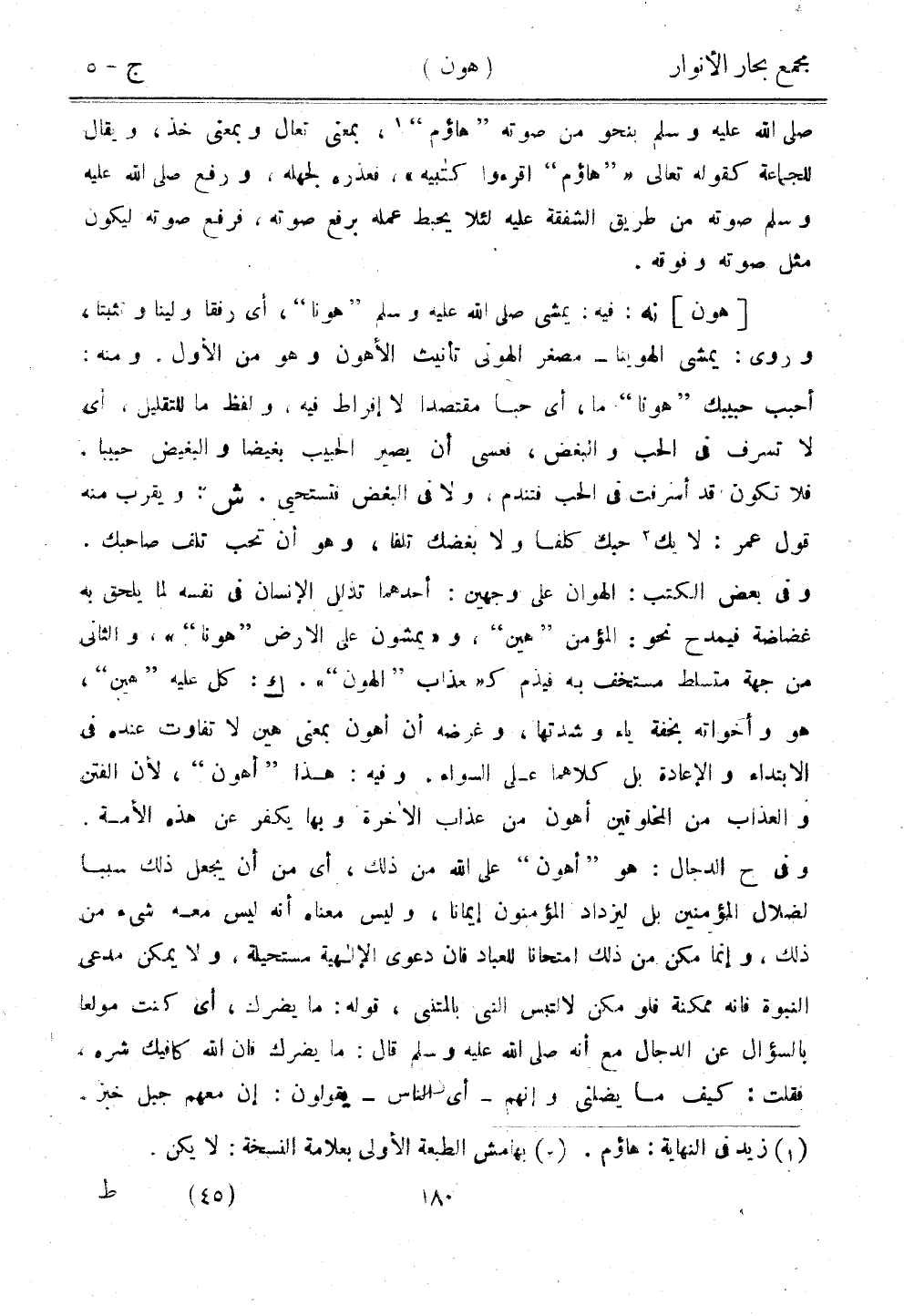 [هون] نه: فيه: يمشي صلى الله عليه وسلم "هونا"، أي رفقًا ولينا وتثبتًا، وروي: يمشي الهوينا - مصغر الهونى تأنيث الأهون وهو من الأول. ومنه: أحبب حبيبك "هونا" ما، أي حبًا مقتصدًا لا إفراط فيه، ولفظ ما للتقليل، أي لا تسرف في الحب والبغض، فعسى أن يصير الحبيب بغيضًا والبغيض حبيبًا. فلا تكون قد أسرفت في الحب فتندم، ولا في البغض فتستحي. ش: ويقرب منه قول عمر: لا بك حبك كلفا ولا بغضك تلفا، وهو أن تحب تلف صاحبك. وفي بعض الكتب: الهوان على وجهين: أحدهما تذلل الإنسان في نفسه لما يلحق به غضاضة فيمدح نحو: المؤمن "هين"، و"يمشون على الأرض "هونا""، والثاني من جهة متسلط مستخف به فيذم كـ"عذاب "الهون"". ك: كل عليه "هين"، هو وأخواته بخفة ياء وشدتها، وغرضه أن أهون بمعنى هين لا تفاوت عنده في الابتداء والإعادة بل كلاهما على السواء. وفيه: هذا "أهون"، لأن الفتن والعذاب من المخلوقين أهون من عذاب الآخرة وبها يكفر عن هذه الأمة. وفي ح الدجال هو "أهون" على الله من ذلك، أي من أن يجعل ذلك سببًا لضلال المؤمنين بل ليزداد المؤمنون إيمانًا، وليس معناه أنه ليس معه شيء من ذلك. وإنما مكن من ذلك امتحانًا للعباد فإن دعوى الإلهية مستحيلة، ولا يمكن مدعي النبوة فإنه ممكنة فلومن لالتبس التي بالمتني، قوله: ما يضرك، أي كنت مولعًا بالسؤال عن الدجال مع أنه صلى الله عليه وسلم قال: مايضرك فإن الله كافيك شره، فقلت: كيف ما يضلني وإنهم - أي الناس - يقولون: إن معهم جبل خبز.