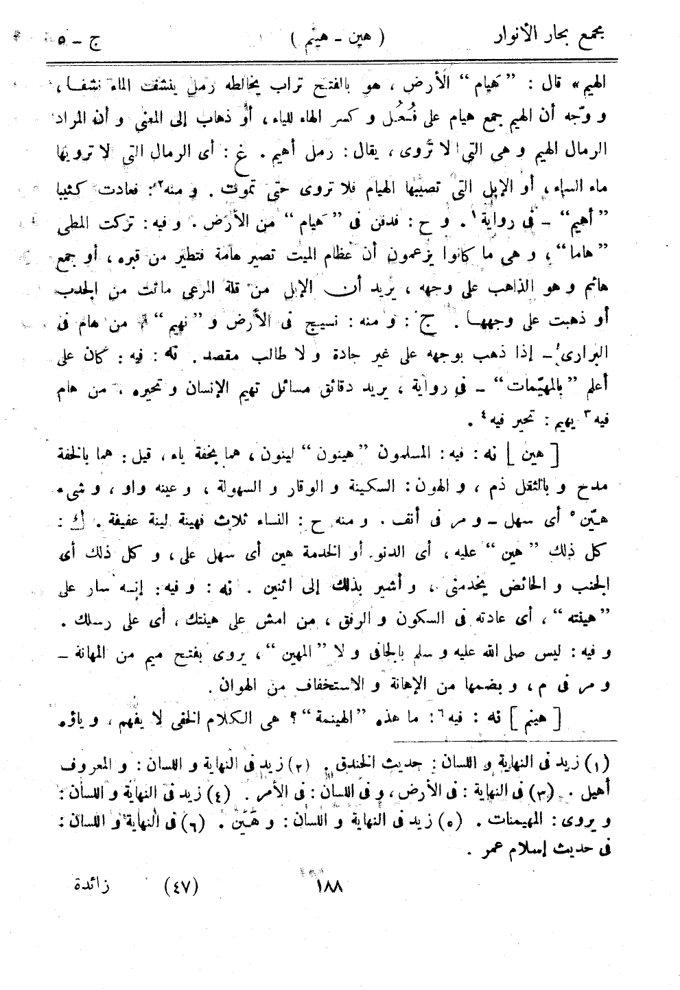 الهيم" قال: "هيام" الأرض، هو بالفتح تراب بخالطه رمل ينشفت الماء نشفا، ووجه أن الهيم جمع هيام على فُعُل وكسر الهاء للياء، أو ذهاب إلى المعنى وأن المراد الرمال الهيم وهي التي لا تروى، يقال: رمل أهيم. غ: أي الرمال التي لا ترويها ماء السماء، أو الإبل التي تصيبها الهيام فلا تروى حتى تموت. ومنه: فعادت كثيبًا "أهيم"-في رواية. وح: فدفن في "هيام" من الأرض. وفيه: تركت المطى "هاما"، وهي ما كانوا يزعمون أن عظام الميت تصير هامة فتطير من قبره، أو جمع هائم وهو الذاهب على وجهه، يريد أن الإبل من قلة المرعى ماتت من الجدب أو ذهبت على وجهها. ج: ومنه: نسيج في الأرض و"نهيم" من هام في البراري - إذا ذهب بوجهه على غير جادة ولا طالب مقصد. نه: فيه: كان على أعلم "بالمهيمات" - في رواية، يريد دقائق مسائل تهيم الإنسان وتحيره. من هام فيه يهيم: تحير فيه.