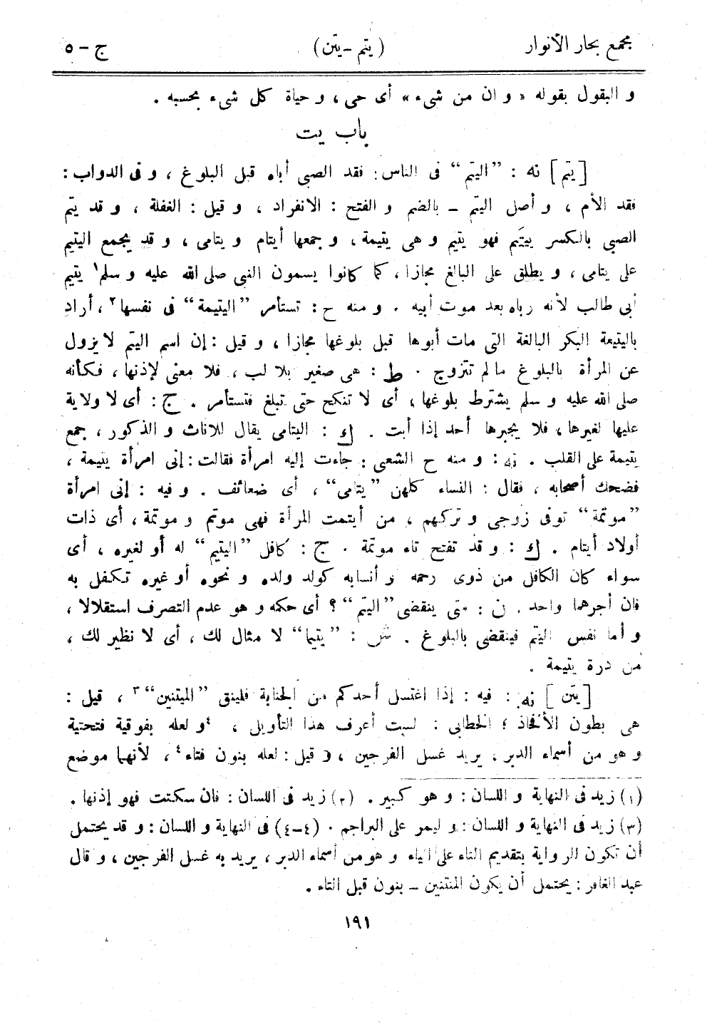 [يتم] نه: "اليتم" في الناس: فقد الصبي أباه قبل البلوغن وفي الدواب: فقد الأم، وأصل اليتم - بالضم والفتح: الانفراد، وقيل: الغفلة، وقد يتم الصبي بالكسر بيتيم فهو يتيم وهي يتيمة، وجمعها أيتام ويتامى، وقد يجمع اليتيم على يتامى، ويطلق على البالغ مجازًا، كما كانوا يسمون النبي صلى الله عليه وسلم يتيم أبي طالب لأنه رباه بعد موت أبيه. ومنه ح: تستأمر "اليتيمة" في نفسها، أراد باليتيعة البكر البالغة التي مات أبوها قبل بلوغها مجازًا، وقيل: إن اسم اليتم لا يزول عن المرأة بالبلوغ ما لم تتزوج. ط: هي صغير بلا لبن فلا معنى لإذنهان فكأنه صلى الله عليه وسلم يشترط بلوغها، أي لا تنكح حتى تبلغ فتستأمر. ج: أي لا ولاية عليها لغيرها، فلا يجبرها أحد إذا أبت. ك: اليتامى يقال للإناث والذكور، جمع يتيمة على القلب. نه: ومنه ح الشعبي: جاءت إليه امرأة فقالت: إني امرأة يتيمة، فضحك أصحابه، فقال: النساء كلهن "يتامى"، أي ضعائف. وفيه: إني امرأة "موتمة" توفى زوجي وتركهم، من أيتمت المرأة فهي موتم وموتمة، أيذات أولاد أيتام. ك: وقد تفتح تاء موتمة. ج: كافل "اليتيم" له أو لغيره، أي سواء كان الكافل من ذوي رحمه وأنسابه كولد ولده ونحوه أو غيره تكفل به فإن أجرهما واحد، ن: متى ينقضي "اليتم"؟ أي حكمه وهو عدم التصرف استقلالا، وأما نفس اليتم فينقضي بالبلوغ. ش: "يتيما" لا مثال لك، أي لا نظير لك، من درة يتيمة.