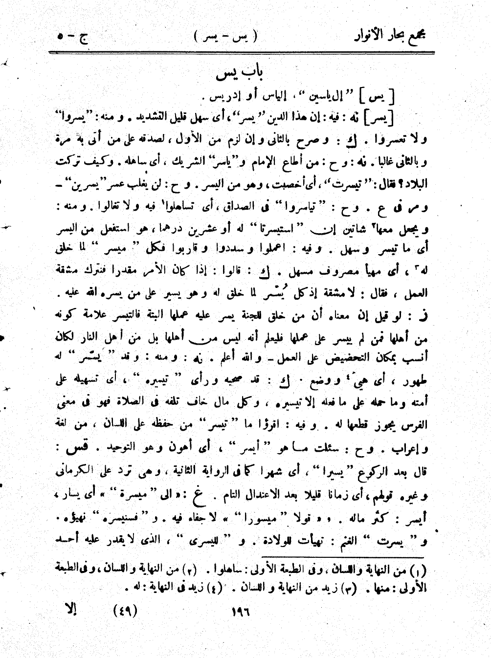 [يسر] نه: فيه: إن هذا الدين "يسر"، أي سهل قليل التشديد. ومنه: "يسروا" ولا تعسروا. ك: وصرح بالثاني وإن لزم من الأول، لصدقه على من أتى به مرة وبالثاني غالبًا. نه: وح: من أطاع الإمام و"ياسر" الشريك، أي ساهله. وكيف تركت البلاد؟ فقال: "تيسرت"، أي أخصبت، وهو من اليسر. وح: لن يغب عسر "يسرين"- ومر في ع. وح: "تياسروا" في الصداق، أي تساهلوا فيه ولا تغالوا. ومنه: ويجعل معها شاتين إن "استيسرنا" له أو عشرين درهما، هو استفعل من اليسر أي من تيسر وسهل. وفيه: اعملوا وسددوا وقاربوا فكل "ميسر" لما خلق له، أي مهيأ مصروف مسهل. ك: قالوا: إذا كان الأمر مقدرًا فنترك مشقة العمل، فقال: لا مشقة إذ كل يُسر لما خلق له وهو يسير على من يسره الله عليه. ز: لو قيل إن معناه أن من خلق للجنة يسر عليه عملها البتة فالتيسر علامة كونه من أهلها فمن لم ييسر على عملها فليعلم أنه ليس من أهلها بل من أهل النار لكان أنسب بمكان التحضيض على العمل - والله أعلم. نه: ومنه: وقد "يسر" له طهور، أي هي ووضع، ك: قد صحبه ورأى "تيسيره"، أي تسهيله على أمته وما حمله على ما فعله إلا تيسيره، وكل مال خاف تلفه في الصالة فهو في معنى الفرس يجوز قطعها له. وفيه: اقرؤا ما "تيسر" من حفظه على اللسان، من لغة وإعراب. وح: سئلت ماهو "أيسر"، أي أهون وهو التوحيد. قس: قال بعد الركوع "يسيرا"، أي شهرًا كما في الرواية الثانية، وهي ترد على الكرماني وغيره قولهم، أي زمانًا قليلًا بعد الاعتدال التام. غ: "إلى "ميسرة"" أي يسار، أيسر: كثر ماله. ""قولا "ميسورا"" لا جفاء فيه. و"فسنيسره" نهيؤه. و"يسرت" الغنم: تهيأت للولادة. و"لليسرى"، الذي لا يقدر عليه أحد