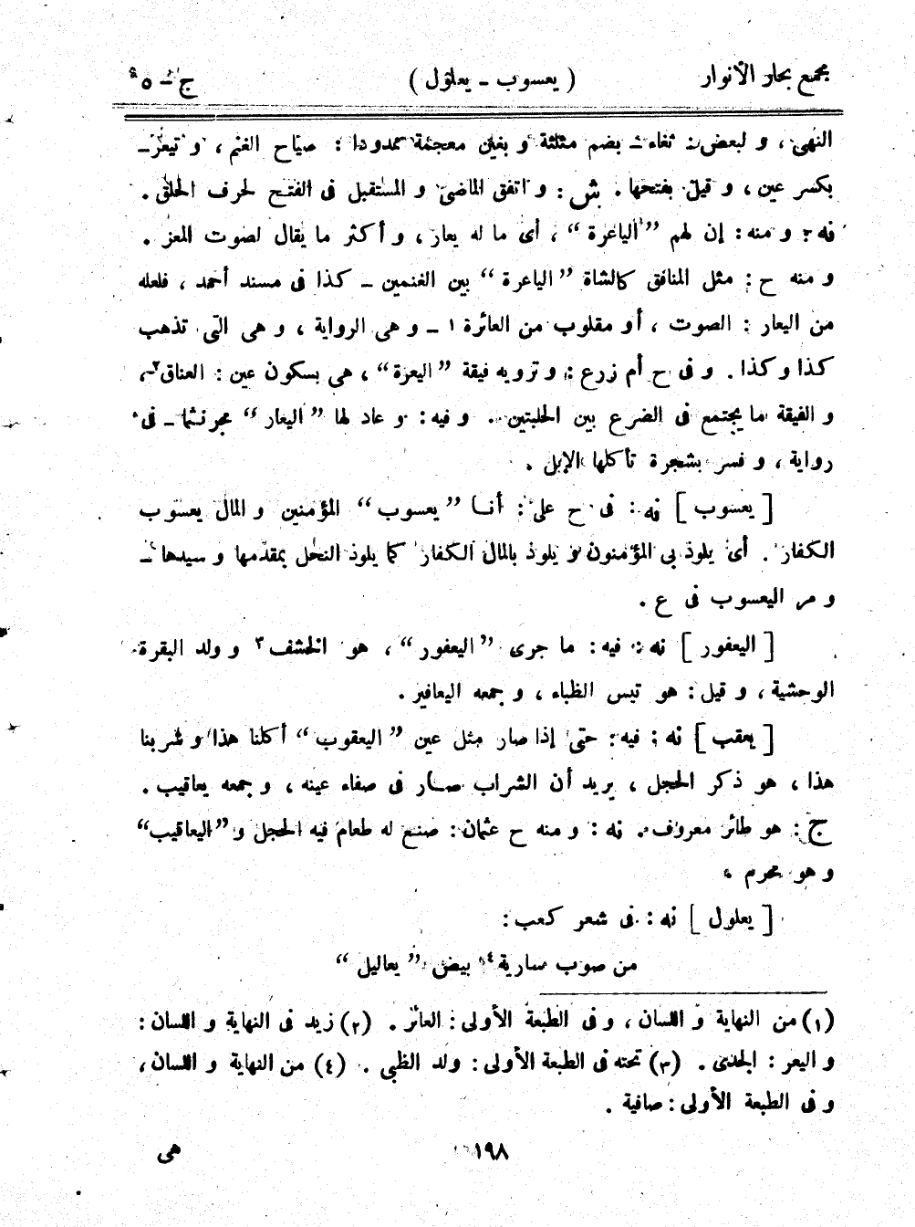 النهي، ولبعض - ثغاء - بضم مثلثة وبغين معجمة ممدودًا: صياح الغنم، وتيعر - بكسر عين، وقيل بفتحها. ش: واتفق الماضي والمستقبل في الفتح لحرف الحلق. نه: ومنه: إن لهم "الياعرة"، أي ما له يعار، وأكثر ما يقال لصوت المعز. ومنه ح: مثل المنافق الشاة "الياعرة" بين الغنمين - كذا في مسند أحمد، فلعله من اليعار: الصوت، أو مقلوب من العائرة- وهي الرواية، وهي التي تذهب كذا وكذا. وفي ح أم زرع: وترويه فيقة "اليعرة"، هي بسكون عين: العناق، والفيقة ما يجتمع في الضرع بين الحلبتين. وفيه: وعاد لها "اليعار" مجرنثما - في رواية، وفسر بشجرة تأكلها الإبل.