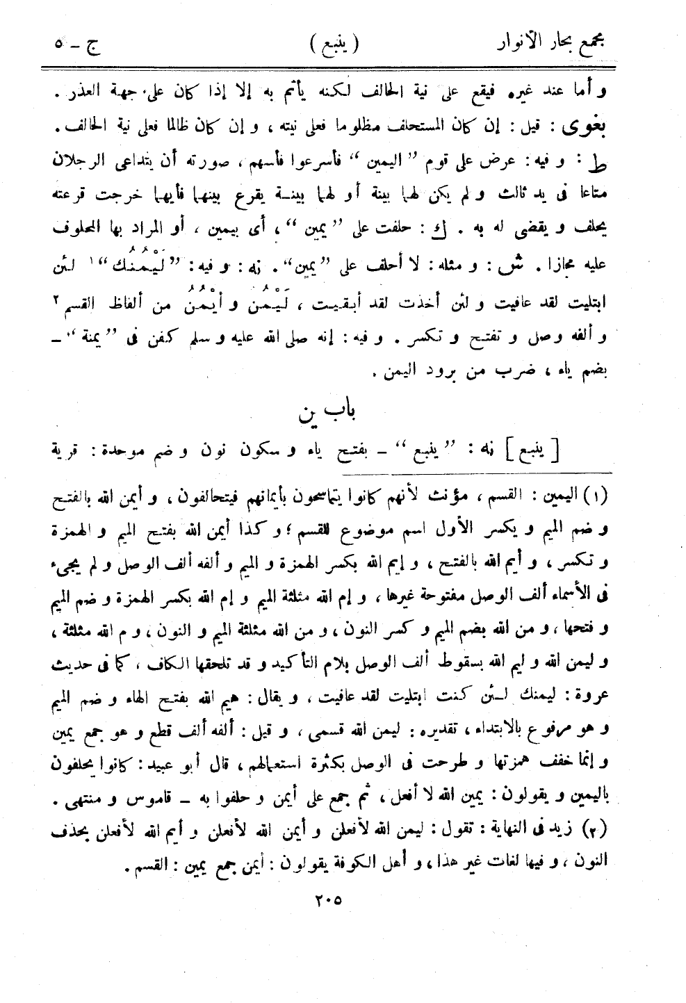 وأما عند غيره فيقع على نية الحالف لكنه يأتم به إلا إذا كان على جهة العذر. بغوي: قيل: إن كان المستحلف مظلومًا فعلى نيته، وإن كان ظالمًا فعلى نية الحالف. ط: وفيه: عرض على قوم "اليمين" فأسرعوا فأسهم، صورته أن يتداعى الرجلان متاعًا في يد ثالث ولم يكن لهما بينة أو لهما بينة يقرع بينهما فأيهما خرجت قرعته يحلف ويقضي له به. ك: حلفت على "يمين"، أي بيمين، أو المراد بها المحلوف عليه مجازًا. ش: ومثله: لا أحلف على "يمين". نه: وفيه: "ليمنك" لئن ابتليت لقد عافيت ولئن أخذت لقد أبقيت، ليمن وأيمن من ألفاظ القسم وألفه وصل وتفتح وتكسر. وفيه: إنه صلى الله عليه وسلم كفن في "يمنة" - بضم ياء، ضرب من برود اليمن.