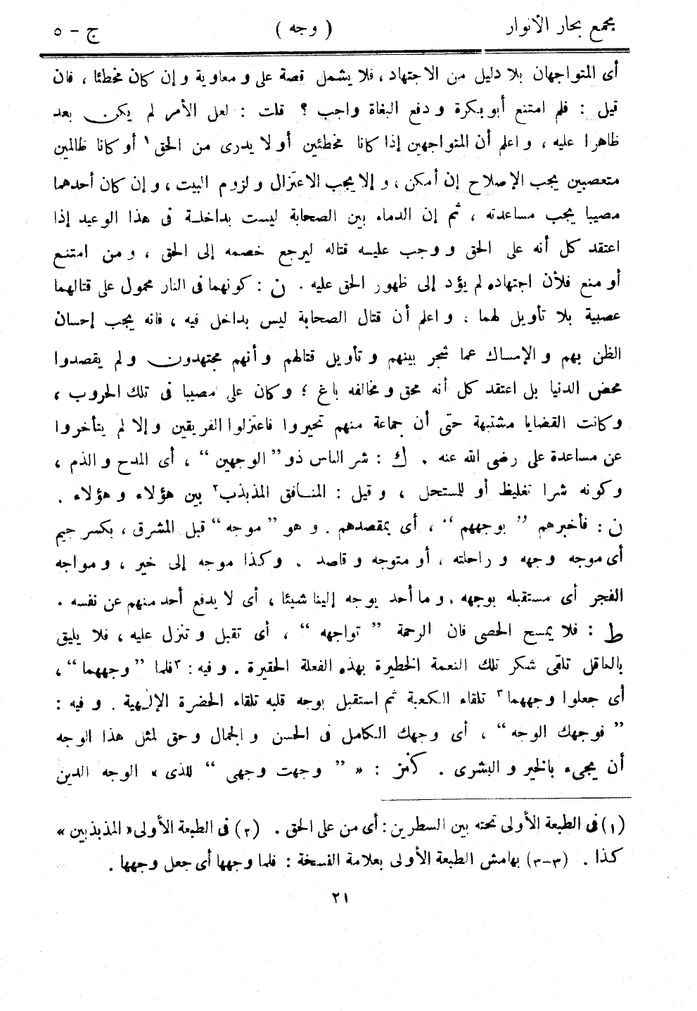 أي المتواجهان بلا دليل من الاجتهاد، فلا يشمل قصة علي ومعاوية وإن كان مخطئًا، فإن قيل: فلم امتنع أبو بكرة ودفع البغاة واجب؟ قلت: لعل الأمر لم يكن بعد ظاهرًا عليه، واعلم أن المتواجهين إذا كانا مخطئين أو لا يدري من الحق أو كانا ظالمين متعصبين يجب الإصلاح إن أمكن، وألا يجب الاعتزال ولزوم البيت، وإن كان أحدهما مصيبًا يجب مساعدته، ثم إن الدماء بين الصحابة ليست بداخلة في هذا الوعيد إذا اعتقد كل أنه على الحق ووجب عليه قتاله ليرجع خصمه إلى الحق، ومن امتنع أو منع فلأن اجتهاده لم يؤد إلى ظهور الحق عليه. ن: كونهما في النار محمول على قتالهما عصبية بلا تأويل لهما، واعلم أن قتال الصحابة ليس بداخل فيه، فإنه يجب إحسان الظن بهم والإمساك عما شجر بينهم وتأويل قتالهم وأنهم مجتهدون ولم يقصدوا محض الدنيا بل اعتقد كل أنه محق ومخالفه باغ؛ وكان علي مصيبًا في تلك الحروب، وكانت القضايا مشتبهة حتى أن جماعة منهم تحيروا فاعتزلوا الفريقين وألا لم يتأخروا عن مساعدة علي رضي الله عنه. ك: شر الناس ذو "الوجهين"، أي المدح والذم، وكونه شرًا تغليظ أو للمستحل، وقيل: المنافق المذبذب بين هؤلاء وهؤلاء. ن: فأخبرهم "بوجههم"ن أي بمقصدهم. وهو "موجه" قبل المشرق، بكسر جيم أي موجه وجهه وراحلته، أو متوجه وقاصد. وكذا موجه إلى خير، ومواجه الفجر أي مستقبله بوجهه. وما أحد يوجه إلينا شيئًا، أي لا يدفع أحد منهم عن نفسه. ط: فلا يمسح الحصى فإن الرحمة "تواجهه"، أي تقبل وتنزل عليه، فلا يليق بالعاقل تلقى شكر تلك النعمة الخطيرة بهذه الفعلة الحقيرة. وفيه: فلما "وجههما"، أي جعلوا وجههما تلقاء الكعبة ثم استقبل بوجه قلبه تلقاء الحضرة الإلهية. وفيه: "فوجهك الوجه"، أي وجهك الكامل في الحسن والجمال وحق لمثل هذا الوجه أن يجيء بالخير والبشرى. كنز: ""وجهت وجهي" للذي" الوجه الدين