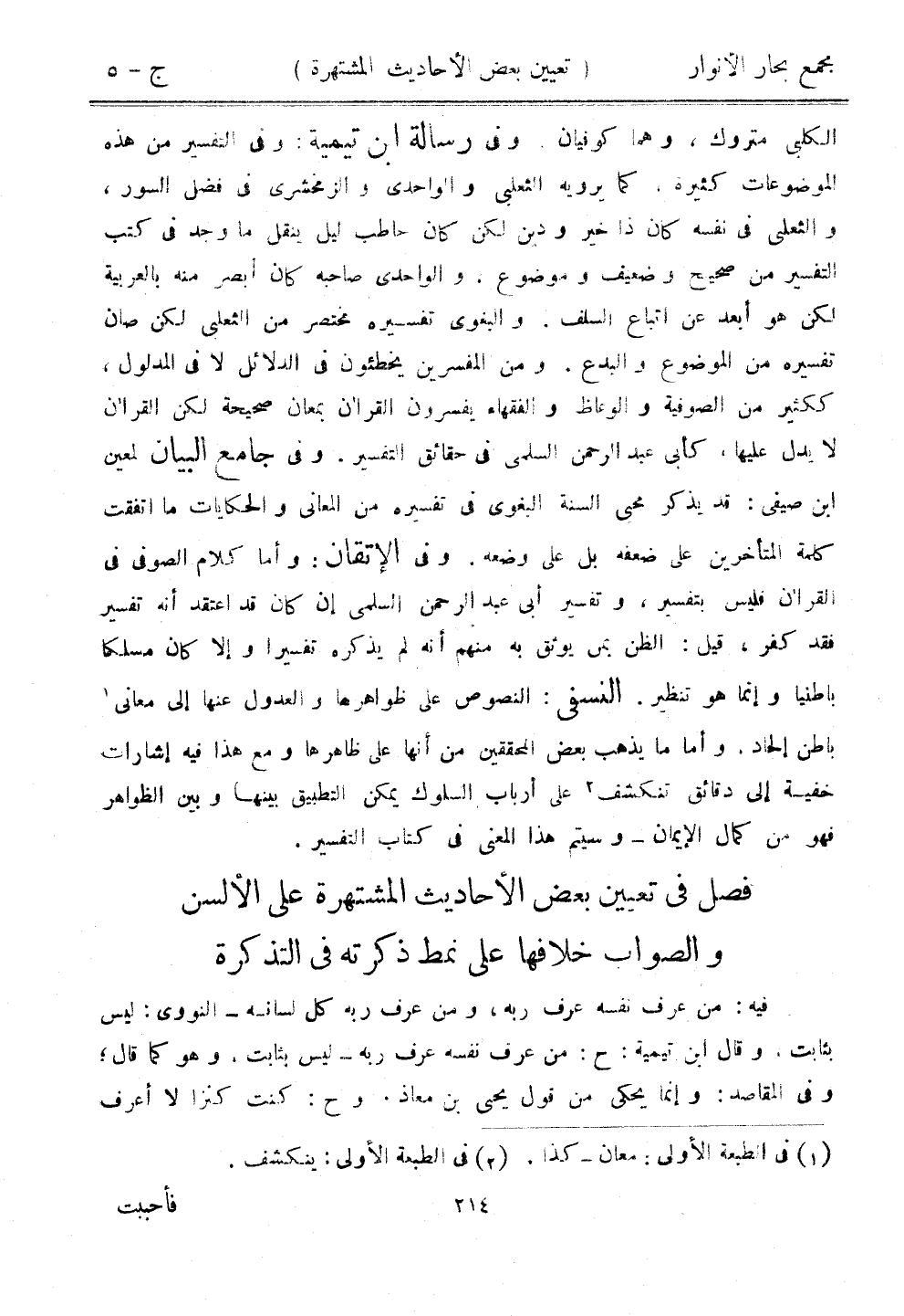 الكلبي متروك، وهما كوفيان. وفي رسالة ابن تيمية: وفي التفسير من هذه الموضوعات كثيرة. كما يرويه الثعلبي والواحدي والزمخشري في فضل السور، والثعلبي في نفسه كان ذا خير ودين لكن كان حاطب ليل ينقل ما وجد في كتب التفسير من صحيح وضعيف وموضوع. والواحدي صاحبه كان أبصر منه بالعربية لكن هو أبعد عن اتباع السلف. والبغوي تفسيره مختصر من الثعلبي لكن صان تفسيره من الموضوع والبدع. ومن المفسرين يخطئون في الدلائل لا في المدلول، ككثير من الصوفية والوعاظ والفقهاء يفسرون القرآن بمعان صحيحة لكن القرآن لا يدل عليها، كأبي عبد الرحمن السلمي في حقائق التفسير. وفي جامع البيان لمعين ابن صيفي: قد يذكر محيي السنة البغوي في تفسيره من المعاني والحكايات ما اتفقت كلمة المتأخرين على ضعيفه بل على وضعه. وفي الإتقان: وأما كلام الصوفي في القرآن فليس بتفسير، وتفسير أبي عبد الرحمن السلمي إن كان قد اعتقد أنه تفسير فقد كفر، قيل: الظن بمن يوثق به منهم أنه لم يذكره تفسيرًا وإلا كان مسلكًا باطنيًا وإنما هو تنظير. النسفي: النصوص على ظواهرها والعدول عنها إلى معاني باطن إلحاد. وأما ما يذهب بعض المحققين من أنها على ظاهرها ومع هذا فيه إشارات خفية إلى دقائق تنكشف على أرباب السلوك يمكن التطبيق بينها وبين الظواهر فهو من كمال الإيمان - وسيتم هذا المعنى في كتاب التفسير.