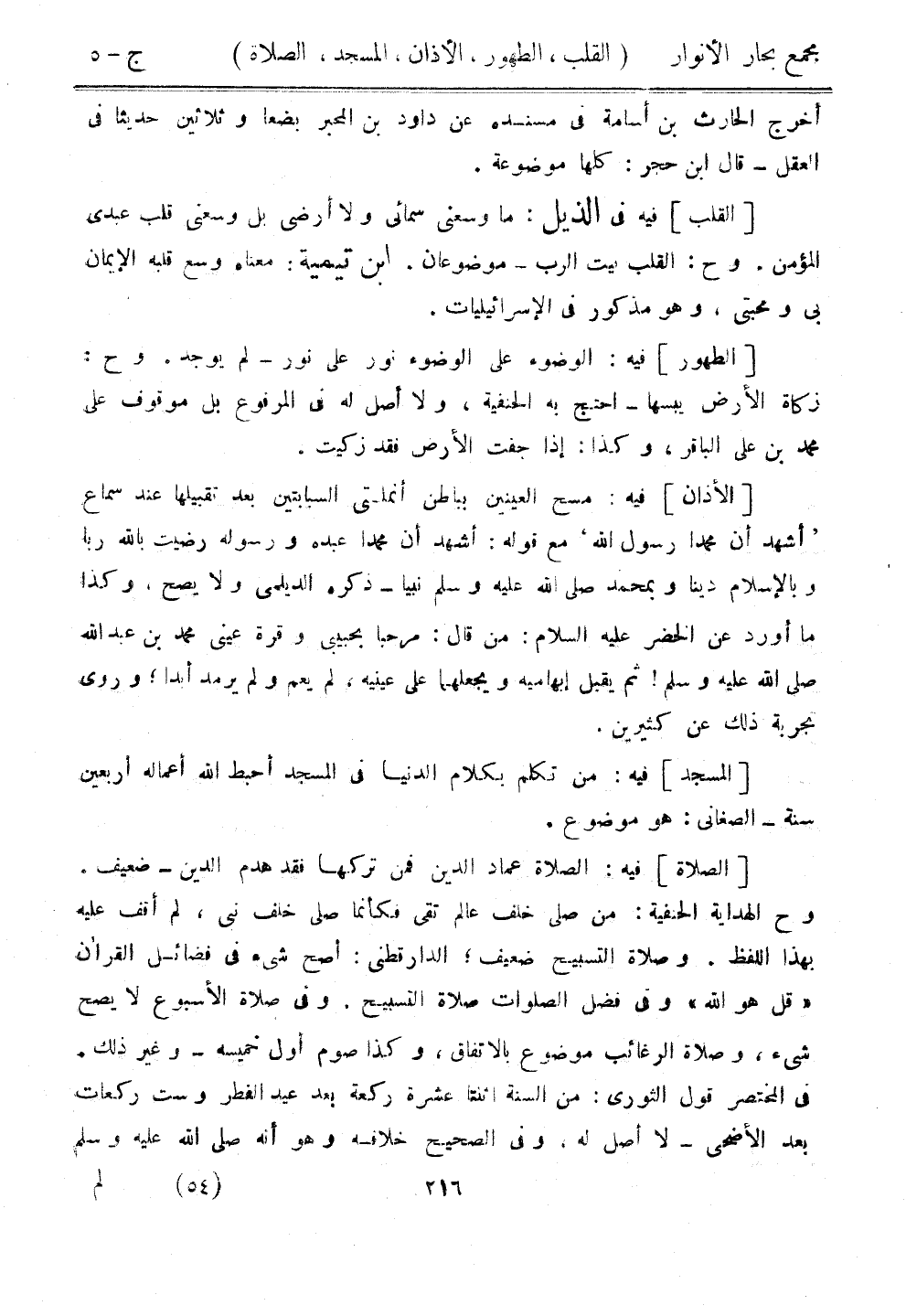 [الصلاة] فيه: الصلاة عماد الدين فمن تركها فقد هدم الدين - ضعيف. وح الهداية الحنفية: من صلىخلف عالم تقي فأنما صلى خلف نبي، لم أقف عليه بهذا اللفظ. وصلاة التسبيح ضعيف؛ الدارقطني: أصح شيء في فضائل القرآن "قل هو الله" وفي فضل الصلوات صلاة التسبيح. وفي صلاة الأسبوع لا يصح شيء، وصلاة الرغائب موضوع بالاتفاق، وكذا صوم أول خميسه - وغير ذلك. في المختصر قول الثوري: من السنة اثنتا عشرة ركعة بعد عيد الفطر وست ركعات بعد الأضحى - لا أصل له. وفي الصحيح خلافه وهو أنه صلى الله عليه وسلم