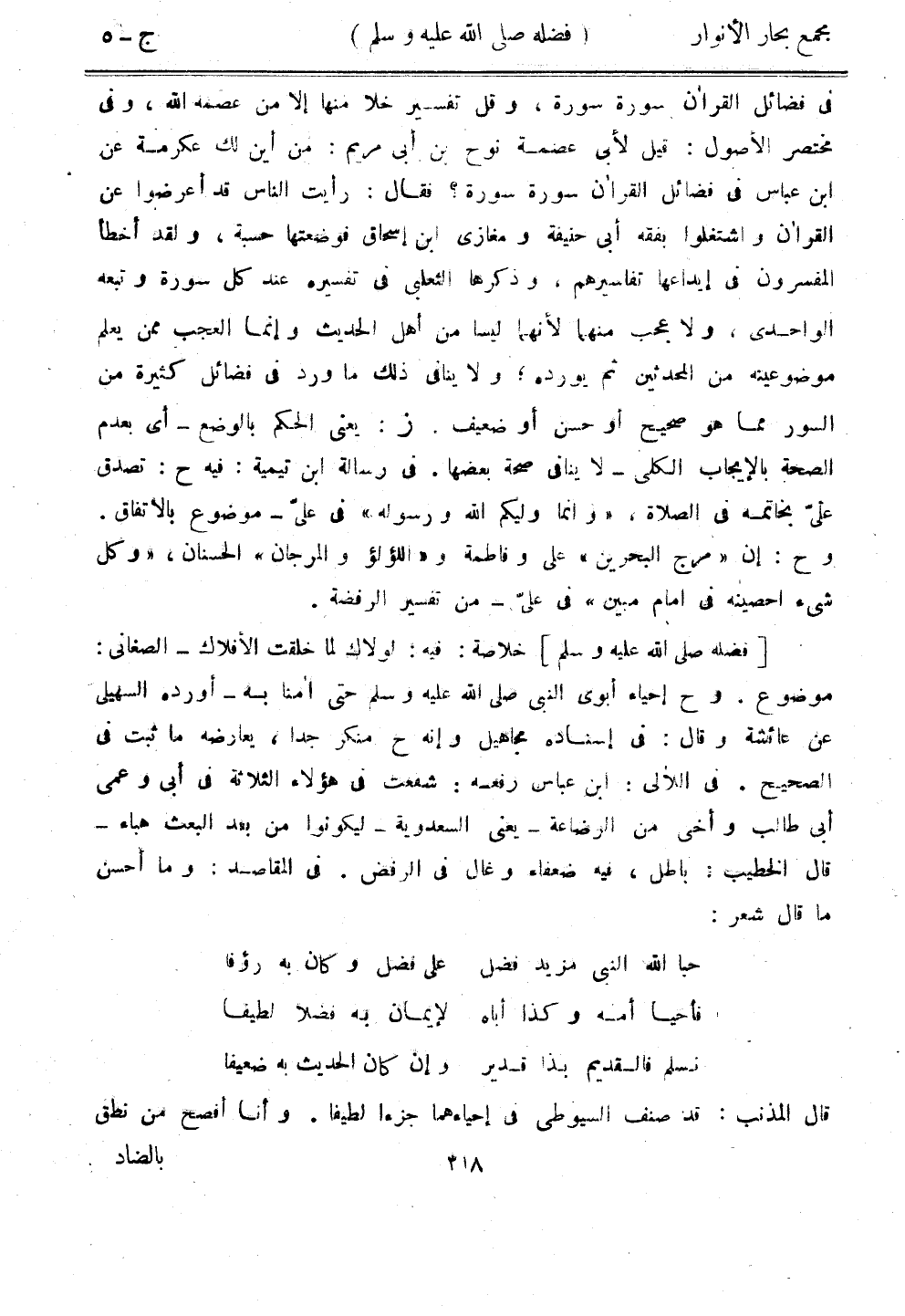 في فضائل القرآن سورة سورة، وقل تفسير خلا منها إلا من عصمه الله، وفي مختصر الأصول: قيل لأبي عصمة نوح بن أبي مريم: من أين لك عكرمة عن ابن عباس في فضائل القرآن سورة سورة؟ فقال: رأيت الناس قد أعرضوا عن القرآن واشتغلوا بفقه أبي حنيفة ومغازي ابن غسحاق فوضعتها حسبة، ولقد أخطأ المفسرون في إيداعها تفاسيرهم، وذكرها الثعلبي في تفسيره عند كل سورة وتبعه الواحدي، ولا عجب منهما لأنهما ليسا من أهل الحديث وإنما العجب ممن يعلم موضوعيته من املحدثين ثم يورده، ولا ينافي ذلك ما رود في فضائل كثيرة من السور ما هو صحيح أو حسن أو ضعيف. ز: يعني الحكم بالوضع - أي بعدم الصحة بالإيجاب الكلي - لا ينافي صحة بعضها. في رسالة ابن تيمية: فيه ح: تصدق علىّ بخاتمه في الصلاة، "وإنما وليكم الله ورسوله" في عليّ - موضوع بالاتفاق. وح: إن "مرج البحرين" علي وفاطمة و"اللؤلؤ والمرجان" الحسنان، "وكل شيء أحصيناه في إمام مبين" في عليّ - من تفسير الرفضة.