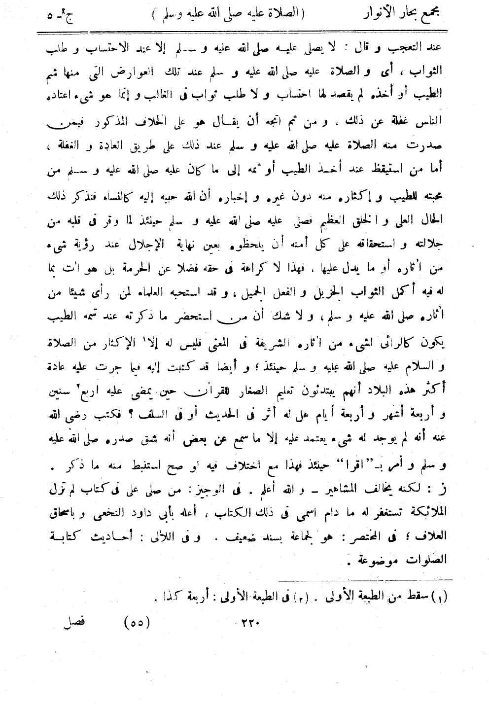 عند التعجب وقال: لا يصلي عليه صلى الله عليه وسلم إلا عند الاحتساب وطلب الثواب، أي والصلاة عليه صلى الله عليه وسلم عند تلك العوارض التي منها شم الطيب أو أخذه لم يقصد لها احتساب ولا طلب ثواب في الغالب وإنما هو شيء اعتاده الناس غفلة عن ذلك، ومن ثم اتجه أن يقال هو على الخلاف المذكور فيمن صدرت منه الصلاة عليه صلى الله عليه وسلم عند ذلك على طريق العادة والغفلة، أما من استيقظ عند أخذ الطيب أو ثمة إلى ما كان عليه صلى الله عليه وسلم من محبته للطيب وإكثاره منه دون غيره وإخباره أن الله حببه إليه كالنساء فنذكر ذلك الحال العلي والخلق العظيم فصلى عليه صلى الله عليه وسلم حينئذ لما وقر في قلبه من جلالته واستحقاقه على كل أمته أن يلحظوه بعين نهاية الإجلال عند رؤية شيء من آثاره أو ما يدل عليها، فهذا لا كراهة في حقه فضلًا عن الحرمة بل هو آت بما له فيه أكمل الثواب الجزيل والفعل الجميل، وقد استحبه العلماء لمن رأى شيئًا من آثاره صلى الله عليه وسلم، ولا شك أن من استحضر ما ذكرته عند شمه الطيب يكون كالرائي لشيء من آثاره الشريفة في المعنى فليسله إلا الإكثار من الصلاة والسلام عليه صلى الله عليه وسلم حينئذ، وأيضًا قد كتبت إليه فيما جرت عليه عادة أكثر هذه البلاد أنهم يبتدئون تعليم الصغار للقرآن حين يمضي عليه أربع سنين وأربعة أشهر وأربعة أيام هل له أثر في الحديث أو في السلف؟ فكتب رضي الله عنه أنه لم يوجد له شيء يعتمد عليه إلا ما سمع عن بعض أنه شق صدره صلى الله عليه وسلم وأمر بـ"اقرأ" حينئذ فهذا مع اختلاف فيه لو صح استنبط منه ما ذكر. ز: لكنه يخالف المشاهير - والله أعلم. في الوجيز: من صلى على في كتاب لم تزل الملائكة تستغفر له ما دام اسمي في ذلك الكتاب، أعله بأبي داود النخعي وبإسحاق العلاف، في المختصر: هو لجماعة بسند ضعيف. وفي اللآلي: أحاديث كتابة الصلوات موضوعة.