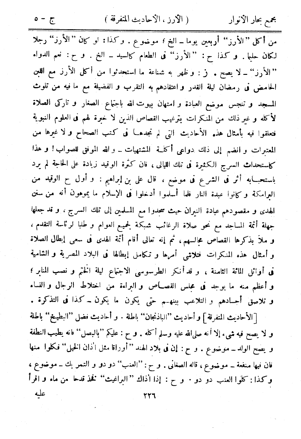 من أكل "الأرز" أربعين يومًا - إلخ؛ موضوع. وكذا: لو كان "الأرز" رجلًا لكان حليمًا. وكذا ح: "الأرز" في الطعام كالسيد - إلخ. وح: نعم الدواء "الأرز" - لا يصح. ز: وظهر به شناعة ما استحدثوا من أكل الأرز مع اللبن الحامض في رمضان ليلة القدر واعتقادهم به التقرب والفضيلة مع ما فيه من تلوث المسجد وتنجس موضع العبادة وامتهان بيوت الله باجتماع الصغار وتاركي الصلاة لأكله وغير ذلك من المنكرات بترغيب القصاص الذين لا خبرة لهم في العلوم النبوية فتعلقوا فيه بأمثال هذه الأحاديث التي لم نجدها في كتب الصحاح ولا غيرها من المعتبرات وانضم إلى ذلك دواعي أكلة المشتهيات - والله الموفق للصواب! وهذا كاستحداث السرج الكثيرة في تلك الليالي، فإن كثرة الوقيد زيادة على الحاجة لم يرد باستحبابه أثر في الشرع في موضع، قال علي بن إبراهيم: وأول ح الوقيد من البرامكة وكانوا عبدة النار فلما أسلموا أدخلوا في الإسلام ما يموهون أنه من سنن الهدى ومقصودهم عبادة النيران حيث سجدوا مع المسلمين إلى تلك السرج، وقد جعلها جهلة أثمة المساجد مع نحو صلاة الرغائب شبكة لجميع العوام وطلبًا لرئاسة التقدم، وملأ بذكرها القصاص مجالسهم، ثم إنه تعالى أقام أئمة الهدى في سعي إبطال الصلاة وأمثال هذه المنكرات فتلاشى أمرها وتكامل إبطالها في البلاد المصرية والشامية في أوائل المائة الثامنة، وقد أنكر الطرسوسي الاجتماع ليلة الختم ونصب المنابر؛ وأعظم منه ما يوجد فيم جلس القصاص والبراءة من اختلاط الرجال والنساء وتلاصق أجسادهم والتلاعب بينهم حتى يكون ما يكون - كذا في التذكرة.