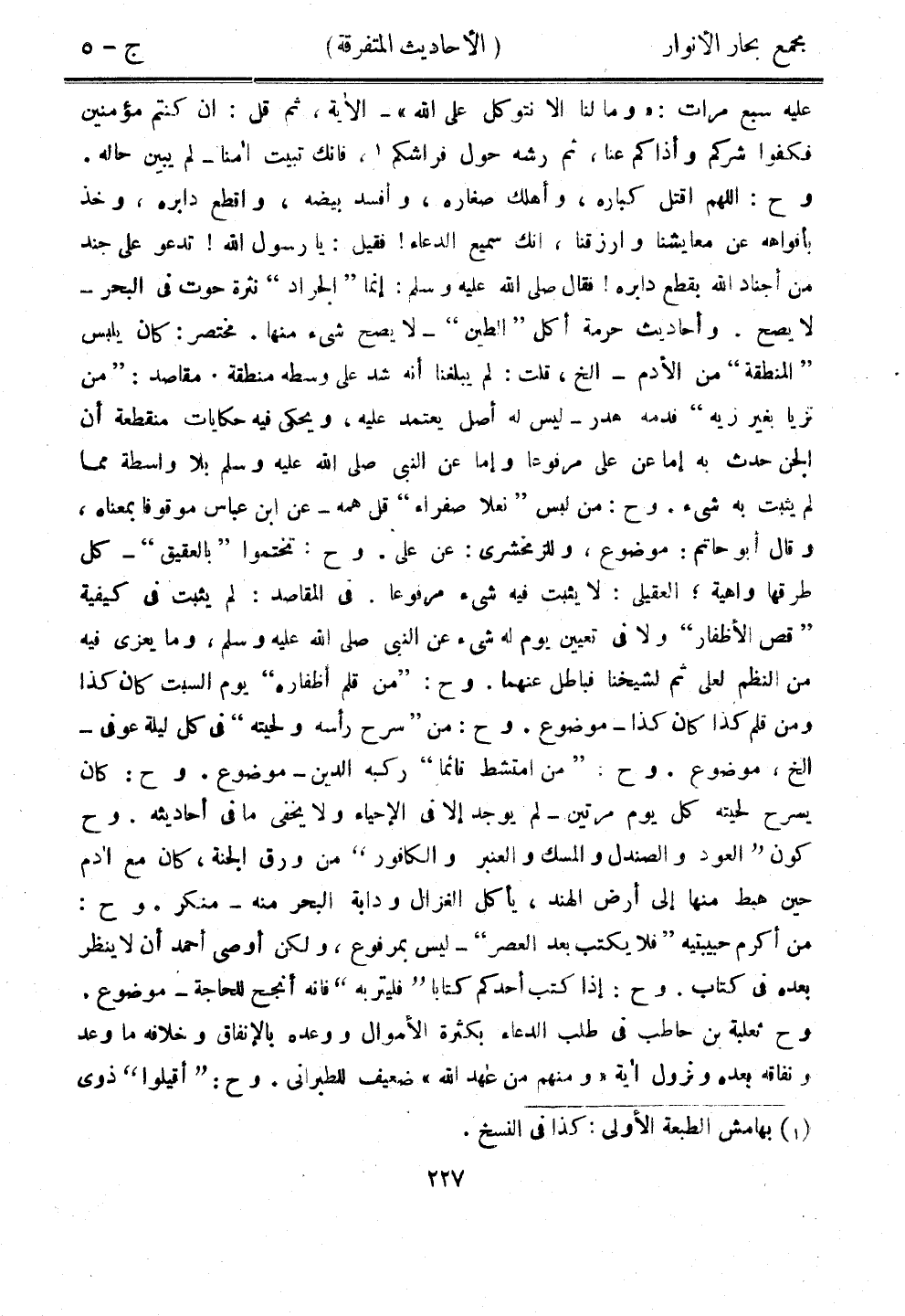 عليه سبع مرات: "وما لنا ألا نتوكل على الله" - الآية، ثم قل: إن كنتم مؤمنين فكفوا شركم وأذاكم عنا، ثم رشه حول فراشكم، فإنك تبيت أمنا - لم يبين حاله. وح: اللهم اقتل كباره، وأهلك صغاره، وأفسد بيضه، واقطع دابره، وخذ بأفواهه عن معايشنا وارزقنا، إنك سميع الدعاء! فقيل: يا رسول الله! تدعو على جند من أجناد الله بقطع دابره! فقال صلى الله عليه وسلم: إنما "الجراد" نثرة حوت في البحر - لا يصح. وأحاديث حرمة أكل "الطين" - لا يصح شيء منها. مختصر: كان يلبس "المنطقة" من الأدم - إلخ، قلت: لم يبلغنا أنه شد على وسطه منطقة. مقاصد: "من تزيا بغير زيه" فدمه هدر - ليس له أصل يعتمد عليه، ويحكي فيه حكايات منقطعة أن الجن حدث به إما عن علي مرفوعًا وإما عن النبي صلى الله عليه وسلم بلا واسطة مما لم يثبت به شيء. وح: من لبس "نعلًا صفراء" قل همه - عن ابن عباس موقوفًا بمعناه، وقال أبو حاتم: موضوع، وللزمخشري: عن علي. وح: تختموا "بالعقيق" - كل طرقها واهية، العقيلي: لا يثبت فيه شيء مرفوعًا. في المقاصد: لم يثبت في كيفية "قص الأظفار" ولا في تعيين يوم له شيء عن النبي صلى الله عليه وسلم، وما يعزى فيه من النظم لعلي ثم لشيخنا فباطل عنهما. وح: "من قلم أظفاره" يوم السبت كان كذا ومن قلم كذا كان كذا - موضوع. وح: من "سرح رأسه ولحيته" في كل ليلة عوفي - إلخ، موضوع. وح: "من امتشط نائما" ركبه الدين - موضوع. وح: كان يسرح لحيته كل يوم مرتين - لم يوجد إلا في الإحياء ولا يخفى ما في أحاديثه. وح كون "العود والصندل والمسك والعنبر والكافور" من ورق الجنة، كان مع أدم حين هبط منها إلى أرض الهند، يأكل الغزال ودابة البحر منه - منكر. وح: من أكرم حبيبتيه "فلا يكتب بعد العصر" - ليس بمرفوع، ولكن أوصى أحمد أن لا ينظر بعده في كتاب. وح: إذا كتب أحدكم كتابًا "فليتربه" فإنه أنجح للحاجة - موضوع. وح ثعلبة بن حاطب في طلب الدعاء بكثرة الأموال ووعده بالإنفاق وخلافه ما وعد ونفاقه بعده ونزول آية "ومنهم من عاهد الله" ضعيف للطبراني. وح: "أقيلوا" ذوي