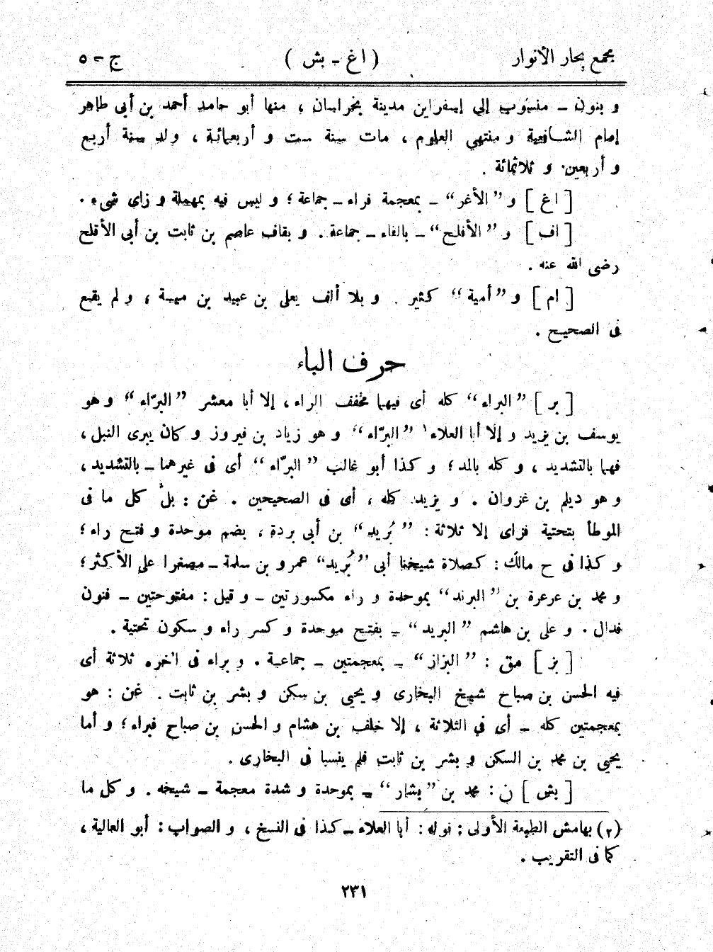 [بر] "البراء" كله أي فيهما مخفف الراء، إلا أبا معشر "البراء" وهو يوسف بن يزيد وإلا أبا العلاء "البراء" وهو زياد بن فيروز وكان يبري النبل، فهما بالتشديد، وكله بالمد، وكذا أبو غالب "البراء" أي في غيرهما - بالتشديد، وهو ديلم بن غزوان. ويزيد كله، أي في الصحيحين. عن: بل كل ما في الموطأ بتحتية فزاي إلا ثلاثة: "بُريد" بن أبي بردة، بضم موحدة وفتح راء، وكذا في ح مالك: كصلاة شيخنا أبي "بُريد" بن أبي بردة، بضم موحدة وفتح راء، وكذا في ح مالك: كصلاة شيخنا أبي "بُريد" عمرو بن سلمة - مصغرًا على الأكثر؛ ومحمد بن عرعرة بن "البرند" بموحدة وراء مكسورتين - وقيل: مفتوحتين - فنون فدال. وعلى بن هاشم "البريد" - بفتح موحدة وكسر راء وسكون تحتية.