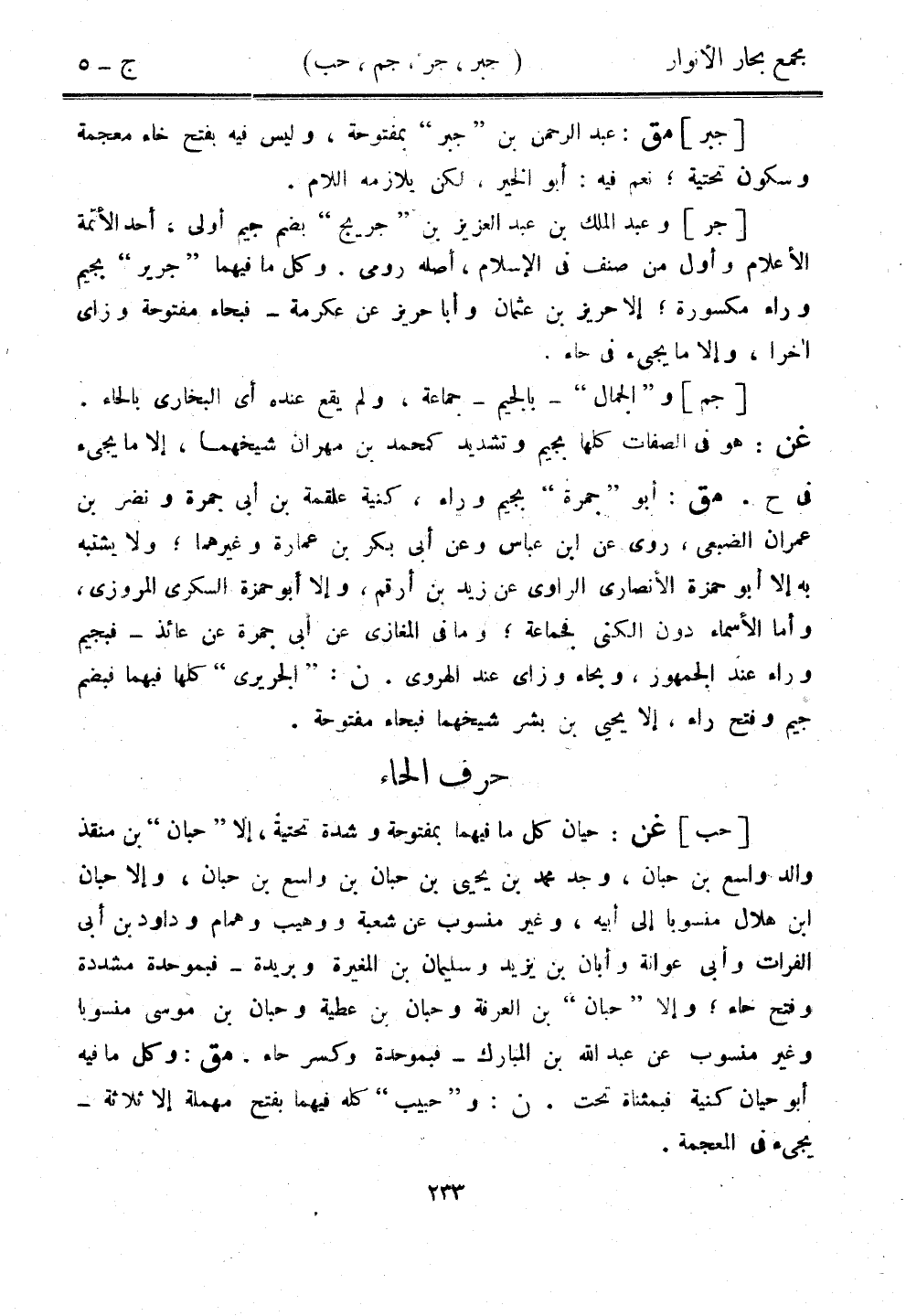 [جر] وعبد الملك بن عبد العزيز بن "جريج" بضم جيم أولى، أحد الأئمة الأعلام وأول من صنف في الإسلام، أصله رومي. وكل ما فيهما "جرير" بجيم وراء مكسورة، إلا حريز بن عثمان وأبا حريز عن عكرمة - فبحاء مفتوحة وزاي أخرا، وإلا ما يجيء في حاء.