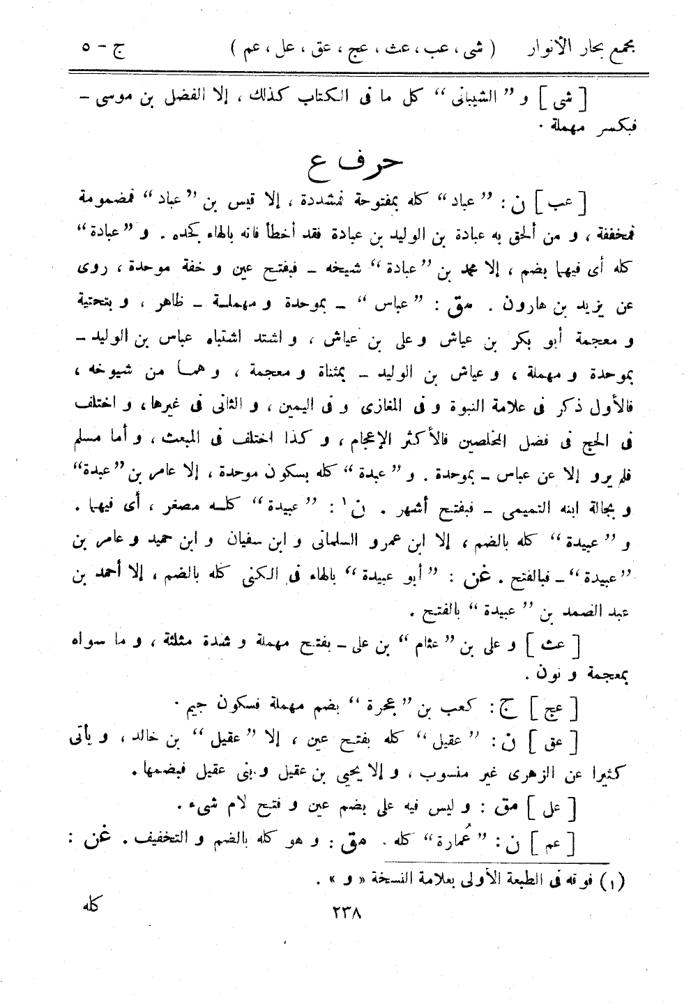 [عب] ن: "عباد" كله بمفتوحة فمشددة، إلا قيس بن "عباد" فمضمومة فمخففة، ومن ألحق به عبادة بن الوليد بن عبادة فقد أخطأ فإنه بالهاء كجده. و"عبادة" كله أي فيهما بضم، إلا محمد بن "عبادة" شيخه- فبفتح عين وخفة موحدة، روى عن يزيد بن هارون. مق: "عباس" - بموحدة ومهملة- ظاهر، وبتحتية ومعجمة أبو بكر بن عياش وعلي بن عياش، واشتد اشتباه عباس بن الوليد- بموحدة ومهملة، وعياش بن الوليد - بمثناة ومعجمة، وهما من شيوخه، فالأول ذكر في علامة النبوة وفي المغازي وفي اليمين، والثاني في غيرها، واختلف في الحج في فضل المخلصين فالأكثر الإعجام، وكذا اختلف في المبعث، وأما مسلم فلم يرو إلا عن عباس - بموحدة. و"عبدة" كله بسكون موحدة، إلا عامر بن "عبدة" وبجالة ابنه التميمي - فبفتح أشهر. ن: "عبيدة" كله مصغر، أي فيهما. و"عبيدة" كله بالضم، إلا ابن عمرو السلماني وابن سفيان وابن حميد وعامر بن "عبيدة" - فبالفتح. عن:"أبو عبيدة" بالهاء في الكنى كله بالضم، إلا أحمد بن عبد الصمد بن "عبيدة" بالفتح.