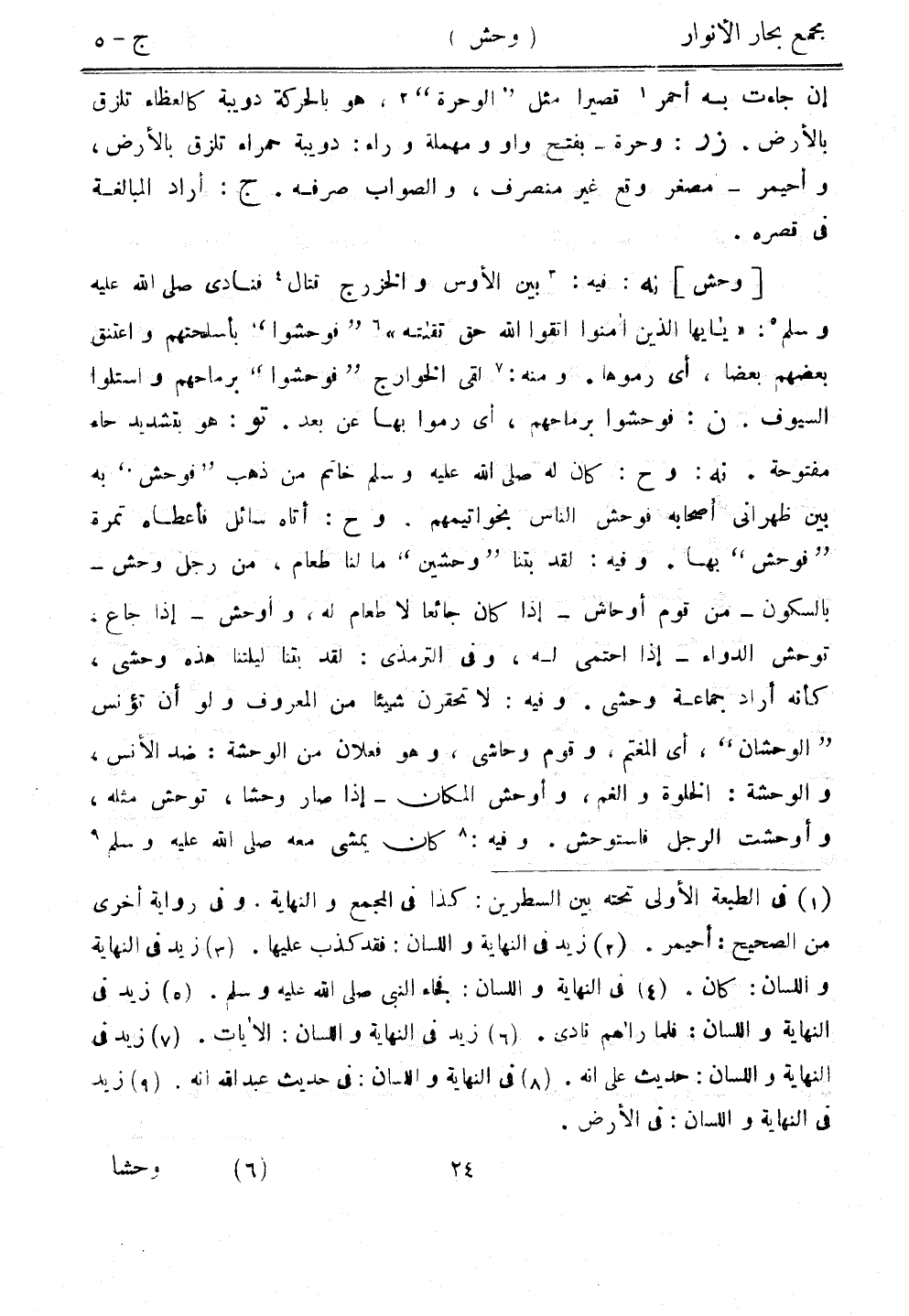 [وحش] نه: فيه: بين الأوس والخزرج قتال فنادى صلى الله عليه وسلم: "يا أيها الذين آمنوا اتقوا الله حق تقاته" "فوحشوا" بأسلحتهم واعتنق بعضهم بعضا، أي رموها. ومنه: لقي الخوارج "فوحشوا" برماحهم واستلوا السيوف. ن: فوحشوا برماحهم، أي رموا بها عن بعد. تو: هو بتشديد حاء مفتوحة. نه: وح: كان له صلى الله عليه وسلم خاتم من ذهب "فوحش" به بين ظهراني أصحابه فوحش الناس بخواتيمهم. وح: أتاه سائل فأعطاه تمرة "فوحش" بها. وفيه: لقد بتنا "وحشين" ما لنا طعام، من رجل وحش - بالسكون - من قوم أوحاش - إذا كان جائعًا لا طعام له، وأوحش - إذا جاع، توحش الدواء - إذا احتمى له، وفي الترمذي: لقد بتنا ليلتنا هذه وحشي، كأنه أراد جماعة وحشي. وفيه: لا تحقرن شيئًا من المعروف ولو أن تؤنس "الوحشان"، أي المغتم، وقوم وحاشي، وهو فعلان من الوحشة: ضد الأنس، والوحشة: الخلوة والغم، وأوحش المكان - إذا صار وحشًا، توحش مثله، وأوحشت الرجل فاستوحش. وفيه: كان يمشي معه صلى الله عليه وسلم
