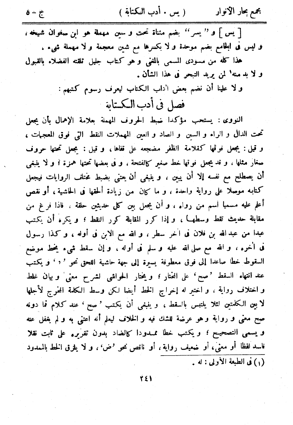 النووي: يستحب مؤكدًا ضبط الحروف المهملة بعلامة الإهمال بأن يجعل تحت الدال والراء والسين والصاد والعين المهملات النقط التي فوق المعجمات، وقيل: يجعل فوقها كقلامة الظفر مضجعه على قفاها، وقيل: يجعل تحتها حروف صغار مثلها، وقد يجعل فوقها خط صغير كالفتحة، وفي بعضها تحتها همزة، ولا ينبغي أن يصطلح مع نفسه إلا أن يبين، وينبغي أن يعتني بضبط مختلف الروايات فيجعل كتابه موصلًا على رواية واحدة، وما كان من زيادة ألحقها في الحاشية، أو نقص أعلم عليه مسميًا اسم من رواه، وأن يجعل بين كل حديثين حلقة، فإذا فرغ من مقابلة حديث نقط وسطها، وإذا كرر المقابلة كرر النقط؛ ويكره أن يكتب عبدًا من عبد الله بن فلان في آخر سطر، والله مع الابن في أوله، وكذا رسول في آخره، والله مع صلى الله عليه وسلم في أوله، وإن سقط شيء يخط موضع السقوط خطًا صاعدًا على فوق معطوفة يسيرة إلى جهة حاشية اللحق نحو " ' " ويكتب عند انتهاء السقط "صح" على المختار، ويختار الحواشي لشرح معنى وبيان غلط واختلاف رواية، واختير له إخراج الخط أيضًا لكن وسط الكلمة المخرج لأجلها لا بين الكلمتين لئلا يلتبس بالسقط، وينبغي أن يكتب "صح" عند كلام فما دونه صح معنى ورواية وهو عرضة للشك فيه والخلاف ليعلم أنه اعتنى به ولم يغفل عنه ويسمى التصحيح؛ ويكتب خطا ممدودًا كالضاد بدون تقريره على ثابت نقلًا فاسد لفظًا أو معنى، أو ضعيف رواية، أو ناقص نحو "ض"، ولا يلزق الخط بالممدود