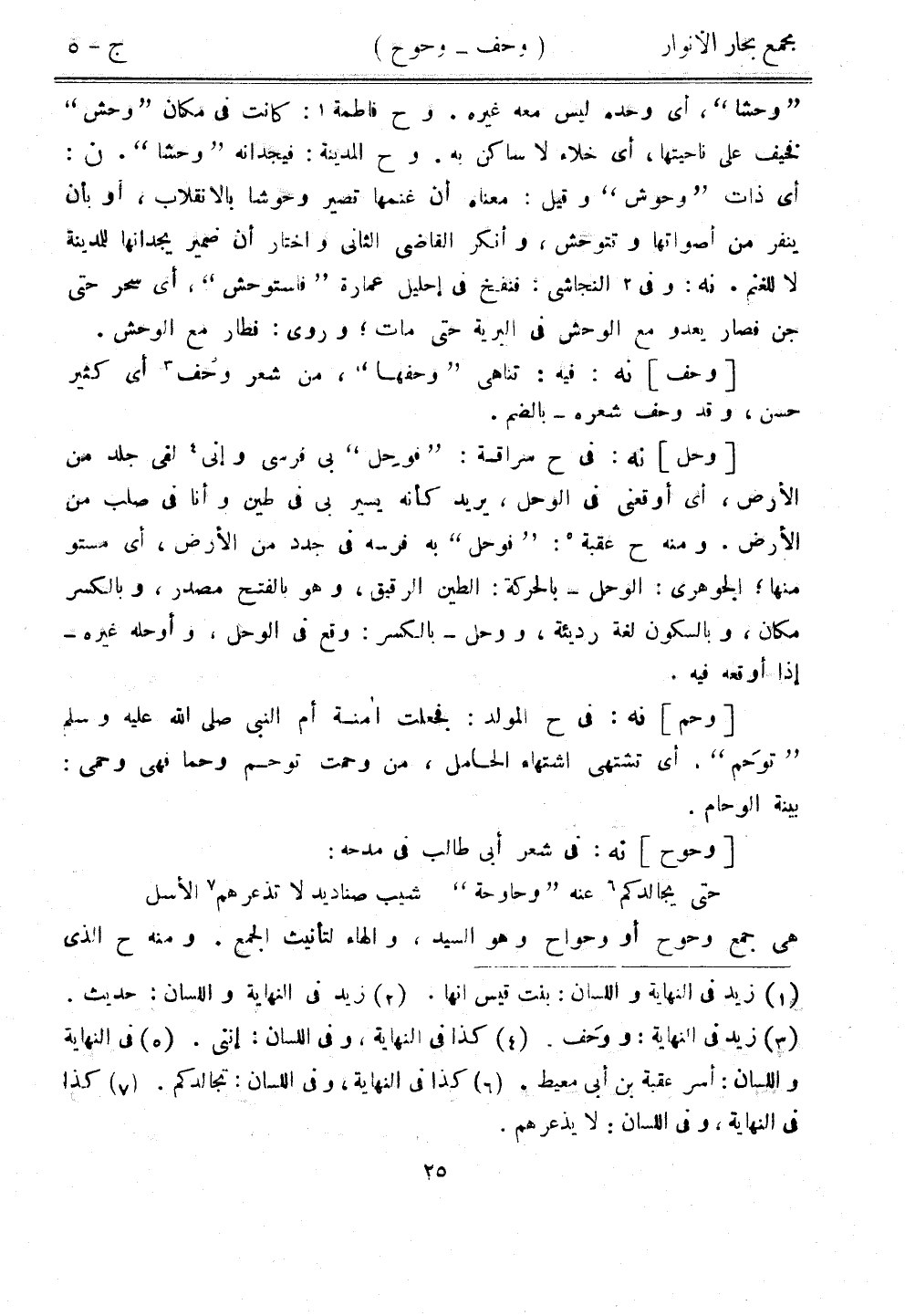 "وحشا"، أي وحده ليس معه غيره. وح فاطمة: كانت في مكان "وحش" فخيف على ناحيتها، أي خلاء لا ساكن به. وح المدينة: فيجدانه "وحشا". ن: أي ذات "وحوش" وقيل: معناه أن غنمها تصير وحوشًا بالانقلاب، أو بأن ينفر من أصواتها وتتوحش، وأنكر القاضي الثاني واختار أن ضمير يجدانها للمدينة لا للغنم. نه: وفي النجاشي: فنفخ في إحليل عمارة "فاستوحش"، أي سحر حتى جن فصار يعدو مع الوحش في البرية حتى مات؛ وروي: فطار مع الوحش.