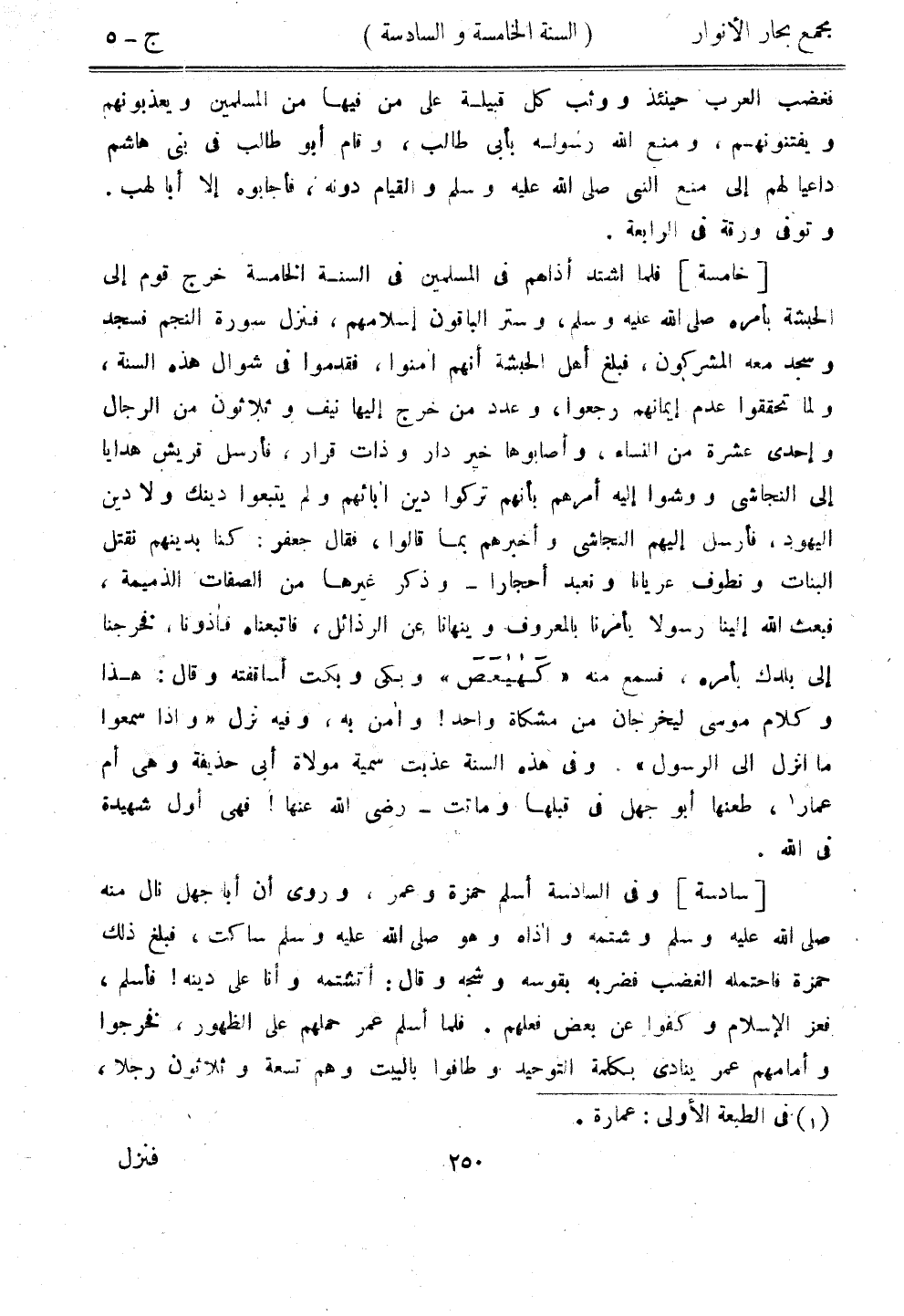 [خامسة] فلما اشتد أذاهم في المسلمين في السنة الخامسة خرج قوم إلى الحبشة بأمره صلى الله عليه وسلم، وستر الباقون إسلامهم، فنزل سورة النجم سجد وسجد معه المشركون، فبلغ أهل الحبشة أنهم آمنوا، فقدموا في شوال هذه السنة، ولما تحققوا عدم إيمانهم رجعوا، وعدد من خرج إليها نيف وثلاثون من الرجال وإحدى عشرة من النساء، وأصابوها خير دار وذات قرار، فأرسل قريش هدايا إلى النجاشي ووشوا إليه أمرهم بأنهم تركوا دين آبائهم ولم يتبعوا دينك ولا دين اليهود، فأرسل إليهم النجاشي واخبرهم بما قالوا، فقال جعفر: كنا بدينهم نقتل البنات ونطوف عريانا ونعبد أحجارًا - وذكر غيرها من الصفات الذميمة، فبعث الله إلينا رسولًا يأمرنا بالمعروف وينهانا عن الرذائل، فاتبعناه فأذونا، فخرجنا إلى بلدك بأمره، فسمع منه "كهيعص" وبكى وبكت أساقفته وقال: هذا وكلام موسى ليخرجان من مشكاة واحد! وأمن به، وفيه نزل "وإذا سمعوا ما أنزل إلى الرسول". وفي هذه السنة عذبت سمية مولاة أبي حذيفة وهي أم عمار، طعنها أبو جعل في قبلها وماتت- رضي الله عنها! فهي أول شهيدة في الله.