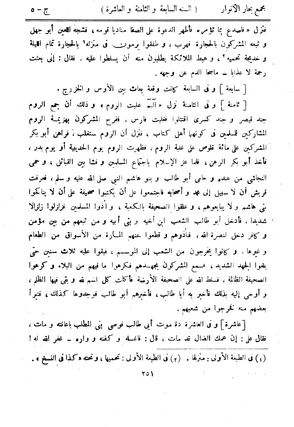 [ثامنة] وفي الثامنة نزل"آلم غلبت الروم" وذلك أن جمع الروم جند قيصر وجند كسرى اقتتلوا فغلبت فارس، ففرح المشركون بهزيمة الروم المشاركين للمسلمين في كونهما أهل كتاب، فنزل أن الروم ستغلب، فراهن أبو بكر المشركين على مائة قلوص على غلبة الروم، فظهرت الروم يوم الحديبية أو يوم بدر، فأخذ أبو بكر الرهن، فلما عز الإسلام باجتماع المسلمين وفشا بين القبائل، وحمى النجاشي من عنده وحامي أبو طالب وبنو هاشم النبي صلى الله عليه وسلم، فعرفت قريش أن لا سبيل إلى محمد وأصحابه فاجتمعوا على أن يكتبوا صحيفة على أن لا ينكاحوا بني هاشم ولا يبايعوهم، وعلقوا الصحيفة بالكعبة، وأذوا المسلمين فزلزلوا زلزالًا شديدًا، فأدخل أبو طالب الشعب ابن أخيه وبنى أبيه ومن تبعهم من بين مؤمن وكافر دخل لنصرة الله، فأذوهم وقطعوا عنهم المارة من الأسواق من الطعام وغيرها، وكانوا يخرجون من الشعب على الموسم، فبقوا عليه ثلاث سنين حتى بلغوا الجهد الشديد، فسمع المشركون بجهدهم فكرهوا ما فيهم من البلاء وكرهوا الصحيفة الظالمة، فسلط الله على الصحيفة الأرضة فأكلت كل اسم لله وبقي فيها الظلم، وأوحى إيه بذلك فأخبر به أبا طالب، فأخبرهم أبو طالب فوجدوها كذلك، فتبرأ بعضهم منه فخرجوا من شعبهم.