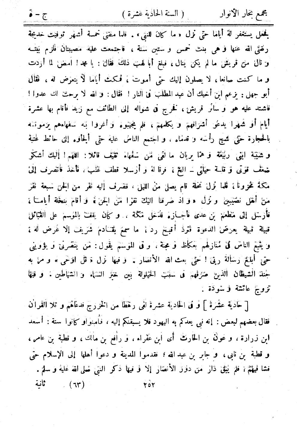 [حادية عشرة] وفي الحادية عشرة لفي رهطا من الخزرج فدعاهم وتلا القرآن فقال بعضهم لبعض: إنه نبي يعدكم به اليهود فلا يسبقنكم إليه، فأمنوا وكانوا ستة: أسعد ابن زرارة، وعون بن الحارث أي ابن عفراء، ورافع بن مالك، وقطبة بن عامر، وقطبة بن نابي، وجابر نب عبد الله، فقدموا المدينة ودعوا أهلها إلى الإسلام حتى فشا فيهم، فلم يبق دار من دور الأنصار إلا وفيها ذكر النبي صلى الله عليه وسلم.