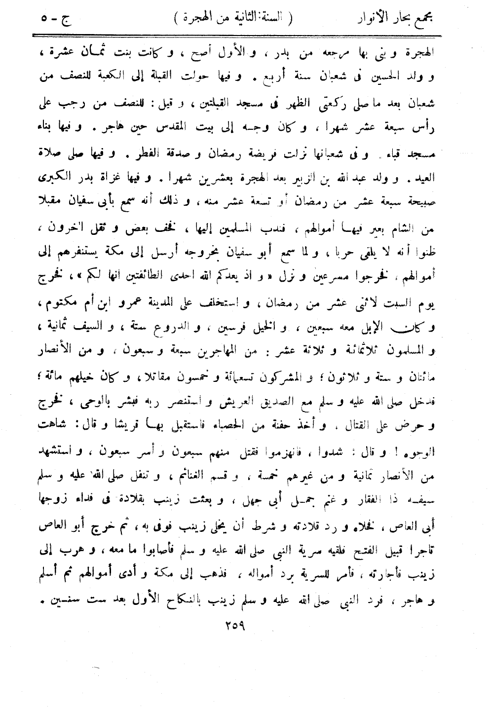 الهجرة وبنى بها مرجعه من بدر، والأول أصح، وكانت بنت ثمان عشرة، وولد الحين في شعبان سنة أربع. وفيها حولت القبلة إلى الكعبة للنصف من شعبان بعد ما صلى ركعتي الهر في مسجد القبلتين، وقيل: للنصف من رجب على رأس سبعة عشر شهرًا، وكان وجه على بيت المقدس حين هاجر. وفيها بناء مسجد قباء. وفي شعبانها نزلت فريضة رمضان وصدقة الفطر. وفيها صلى صلاة العيد. وولد عبد الله بن الزبير بعد الهجرة بعشرين شهرًا. وفيها غزاة بدر الكبرى صبيحة سبعة عشر من رمضان أو تسعة عشر منه، وذلك أنه سمع بأبي سفيان مقبلًا من الشام بعير فيها أموالهم، فندب المسلمين إليها، فخف بعض وثقل آخرون، ظنوا أنه لا يلقى حربًان ولما سمع أبو سفيان بخروجه أرسل على مكة يستنفرهم إلى اموالهم، فخرجوا مسرعين ونزل "وإذ يعدكم الله إحدى الطائفتين أنها لكم"، فخرج يوم السبت لإثني عشر من رمضان، واستخلف على المدينة عمرو بن أم مكتوم، وكان الإبل معه سبعين، والخيل فرسين، الدروع ستة، والسيف ثمانية، والمسلمون ثلاثمائة وثلاثة عشر: من المهاجرين سبعة وسبعون، ومن الأنصار مائتان وستة وثلاثون، والمشركون تسعمائة وخمسون مقاتلا، وكان خيلهم مائة، فدخل صلى الله عليه وسلم مع الصديق العريش واستنصر ربه فبشر بالوحي، فخرج وحرض على القتال، وأخذ حفنة من الحصباء فاستقبل بها قريشًا وقال: شاهت الوجوه! وقال: شدوان فانهزموا فقتل منهم سبعون وأسر سبعون، واستشهد من الأنصار ثمانية ومن غيرهم خمسة، وقسم الغنائم، وتنفل صلى الله عليه وسلم سيفه ذا الفقار وغنم جمل أبي جهل، وبعثت زينب بقلادة في فداء زوجها أبي العاص، فخلاه ورد قلادته وشرط أن يخلي زينب فوفى به، ثم خرج أبو العاص تاجرًا قبيل الفتح فلقيه سرية النبي صلى الله عليه وسلم فأصابوا ما معه، وهرب على زينب فأجارته، فأمر للسرية برد أمواله، فذهب على مكة وأدى أموالهم ثم أسلم وهاجر، فرد النبي صلى الله عليه وسلم زينب بالنكاح الأول بعد ست سنين.