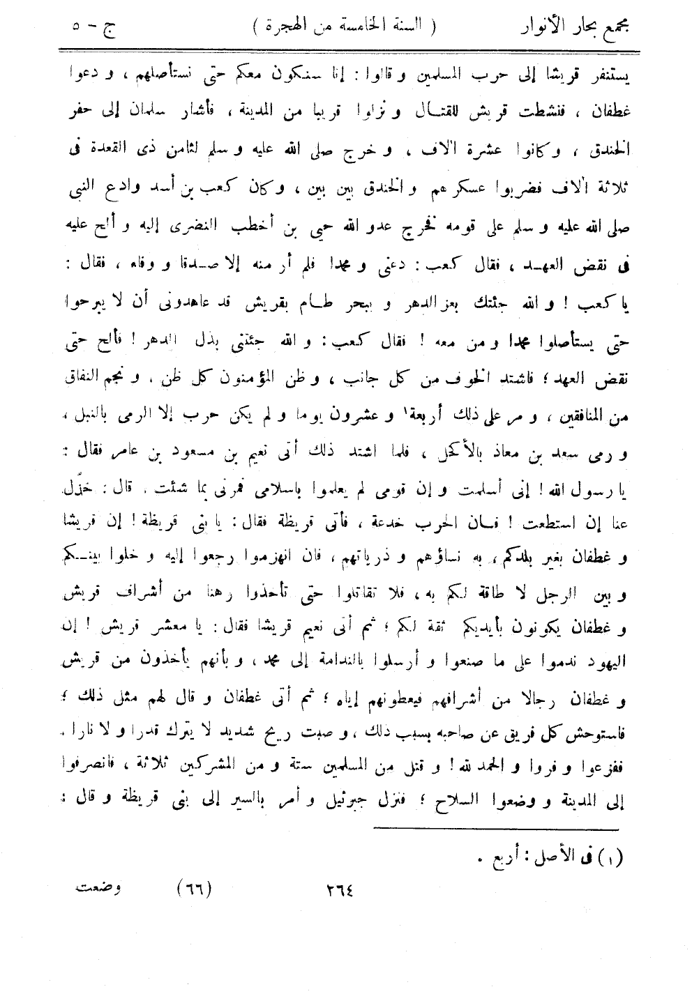 يستنفر قريشًا إلى حرب المسلمين وقالوا: إنا سنكون معكم حتى نستأصلهم، ودعوا غطفان، فنشطت قريش للقتال ونزلوا قريبًا من المدينة، فأشار سلمان إلى حفر الخندق، وكانوا عشرة آلاف، وخرج صلى الله عليه وسلم لثامن ذي القعدة في ثلاثة آلاف فضربوا عسكرهم والخندق بين بين، وكان كعب بن أسد وادع النبي صلى الله عليه وسلم على قومه فخرج عدو الله حيي بن أخطب النضري إليه وألح عليه في نقض العهد، فقال كعب: دعني ومحمدا فلم أر منه إلا صدقًا ووفاء، فقال: يا كعب! والله جئتك بعز الدهر وببحر طام بقريش قد عاهدوني أن لا يبرحوا حتى يستأصلوا محمدًا ومن معه! فقال كعب: والله جئتني بذل الدهر! فألح حتى نقض العهد، فاشتد الخوف من كل جانب، وظن المؤمنون كل ظن، ونجن النفاق من المنافقين، ومر على ذلك أربعة وعشرون يومًا ولم يكن حرب إلا الرمي بالنبل، ورمي سعد بن معاذ بالأكحل، فلما اشتد ذلك أتى نعيم بن مسعود بن عامر فقال: يا رسول الله! إني أسلمت وإن قومي لم يعلموا بإسلامي فمرني بما شئت، قال: خذل عنا إن استطعت! فإن الحرب خدعة، فأتى قريظة فقال: يا بني قريظة! إن قريشًا وغطفان بغير بلدكم، به نساؤهم وذرياتهم، فإن انهزموا رجعوا إليه وخلوا بينكم وبين الرجل لا طاقة لكم به، فلا تقاتلوا حتى تأخذوا رهنًا من أشراف قريش وغطفان يكونون بأيديكم ثقة لكم، ثم أتي نعيم قريشًا فقال: يا معشر قريش! إن اليهود ندموا على ما صنعوا وأرسلوا بالندامة إلى محمد، وبأنهم يأخذون من قريش وغطفان رجالًا من أشرافهم فيعطونهم إياه؛ ثم أتى غطفان وقال لهم مثل ذلك، فاستوحش كل فريق عن صاحبه بسبب ذلك، وصبت ريح شديد لا يترك قدرًا ولا نارًا، ففزعوا وفروا والحمد لله! وقتل من المسلمين ستة ومن المشركين ثلاثة، فانصرفوا إلى المدينة ووضعوا السلاح، فنزل جبرئيل وأمر بالسير إلى بني قريظة وقال: