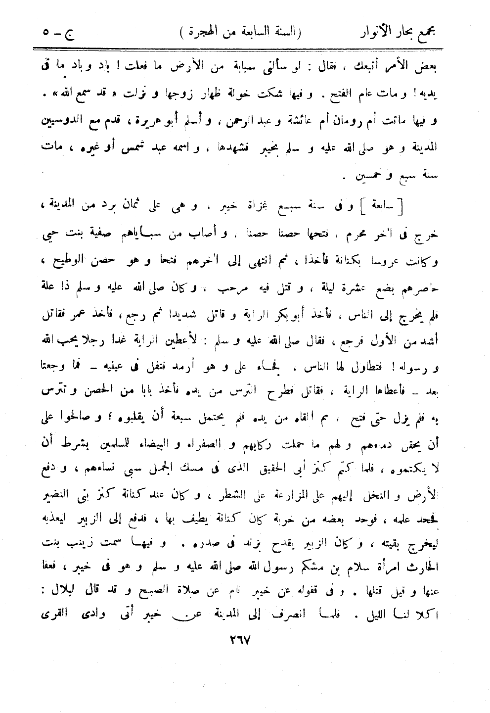 [سابعة] وفي سنة سبع غزاة خيبر، وهي على ثمان برد من المدينة، خرج في آخر محرم، فتحها حصنًا حصنًا، وأصاب من سباياهم صفية بنت حيي وكانت عروسًا بكنانة فأخذا، ثم انتهى إلى آخرهم فتحًا وهو حصن الوطيح، حاصرهم بضع عشرة ليلة، وقتل فيه مرحب، وكان صلى الله عليه وسلم ذا علة فلم يخرج إلى الناس، فأخذ أبو بكر الراية وقاتل شديدًا ثم رجع، فأخذ عمر فقاتل أشد من الأول فرجع، فقال صلى الله عليه وسلم: لأعطين الراية غدًا رجلًا يحب الله ورسوله! فتطاول لها الناس، فجاء علي وهو أرمد فتفل في عينيه - فما وجعتا بعد - فأعطاها الراية، فقاتل فطرح الترس من يده فأخذ بابًا من الحصن وتترس به فلم يزل حتى فتح، ثم ألقاه من يده فلم يحتمل سبعة أن يقلبوه، وصالحوا على أن يحقن دماءهم ولهم ما حملت ركابهم والصفراء والبيضاء للمسلمين بشرط أن لا يكتموه، فلما كتم كنز أبي الحقيق الذي في مسك الجمل سبي نساءهم، ودفع الأرض والنخل إليهم على المزارعة على الشطر، وكان عند كنانة كنز بني النضير فجحد علمه، فوحد بعضه من خربة كان كنانة يطيف بها، فدفع إلى الزبير ليعذبه ليخرج بقيته، وكان الزبير يقدح بزند في صدره. وفيها سمت زينب بنت الحارث امرأة سلام بن مشكم رسول الله صلى الله عليه وسلم وهو في خيبر، فعفا عنها وقيل قتلها. وفي قفوله عن خيبر نام عن صلاة الصبح وقد قال لبلال: أكلا لنا الليل. فلما انصرف إلى المدينة عن خيبر أتى وادي القرى