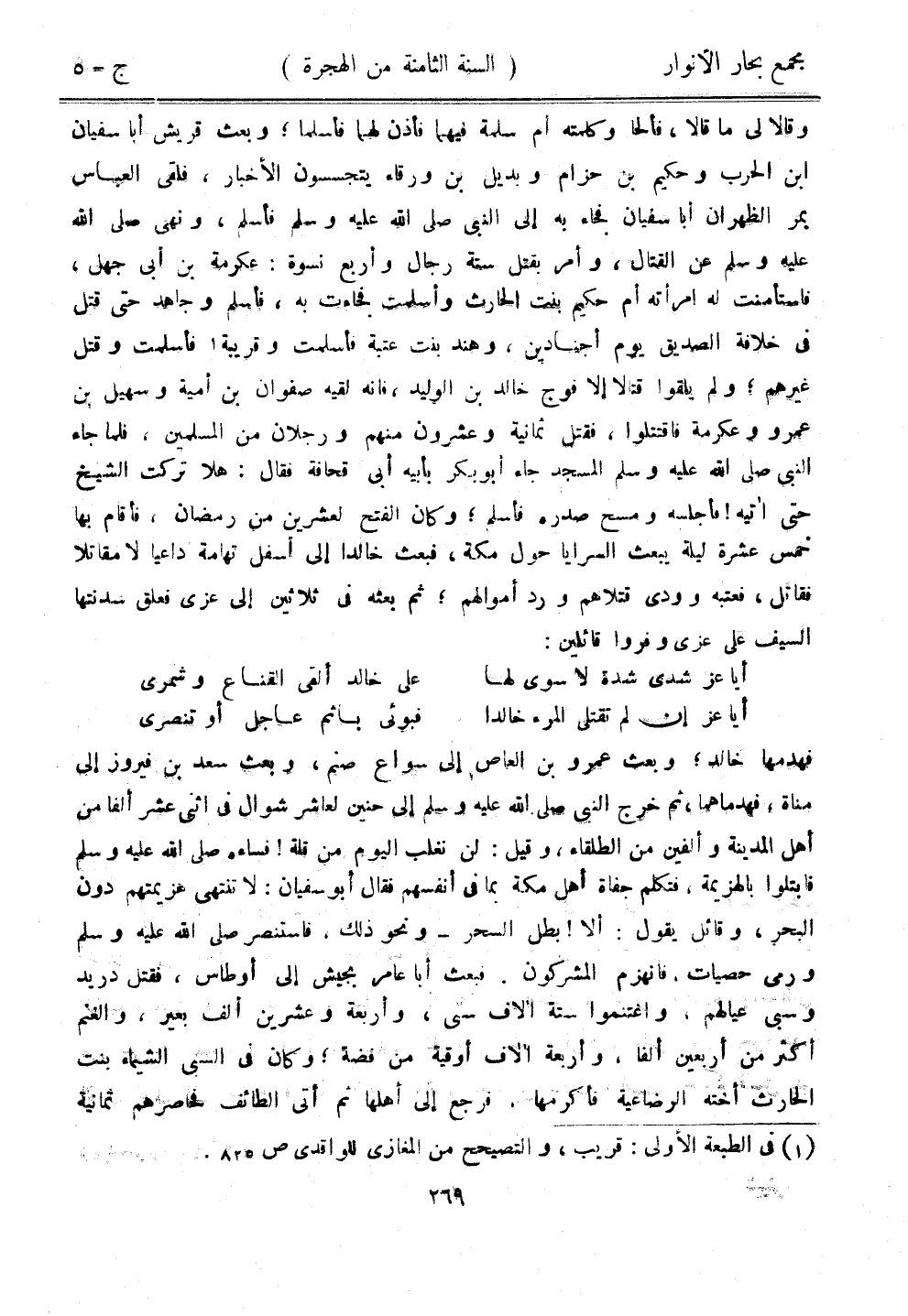 وقالا لي ما قالا، فألحا وكلمته أم سلمة فيهما فأذن لهما فأسلما؛ وبعث قريش أبا سفيان ابن الحرب وحكيم بن حزام وبديل بن ورقاء يتجسسون الأخبار، فلقي العباس يمر الظهران أبا سفيان فجاء به إلى النبي صلى الله عليه وسلم فأسلم، ونهى صلى الله عليه وسلم عن القتال، وأمر بقتل ستة رجال وأربع نسوة: عكرمة بن أبي جهل، فاستأمنت له امرأته أم حكيم بنت الحارث وأسلمت فجاءت به، فأسلم وجاهد حتى قتل في خلافة الصديق يوم أجنادين، وهند بنت عتبة فأسلمت وقريبة فأسلمت وقتل غيرهم، ولم يلقوا قتالًا إلا فوج خالد بن الوليد، فإنه لقيه صفوان بن أمة وسهيل بن عمرو وعكرمة فاقتتلوا، فقتل ثمانية وعشرون منهم ورجلان من المسلمين، فلما جاء النبي صلى الله عليه وسلم المسجد جاء أبو بكر بأبيه أبي قحافة فقال: هلا تركت الشيخ حتى أتيه! فأجلسه ومسح صدره فأسلم، وكان الفتح لعشرين من رمضان، فأقام بها خمس عشرة ليلة يبعث السرايا حول مكة، فبعث خالدًا إلى أسفل تهامة داعيًا لا مقاتلًا فقاتل، فعتبه وودى قتلاهم ورد أموالهم، ثم بعثه في ثلاثين إلى عزى فعلق سدنتها السيف على عزى وفروا قائلين: