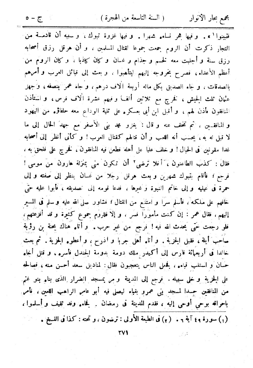 فتبينوا". وفيها هجر نساءه شهرًا. وفيها غزوة تبوك، وسببه أن قادمة من التجار ذكرت أن الروم جمعت جموعًا لقتال المسلمين، وأن هرقل رزق أصحابه رزق سنة وأجلبت معه لخم وجذام وغسان وكان كاذبًا، كان الروم من أعظم الأعداء، فصرح بخروجه إليهم ليتأهبوا، وبعث إلى قبائل العرب وأمرهم بالصدقات، وجاء الصديق بكل ماله أربعة آلاف درهم، وجاء عمر بنصفه، وجهز عثمان ثلث الجيش، فخرج مع ثلاثين ألفًا وفيهم عشرة آلاف فرس، واستاذن المنافقون فأذن لهم، وأقبل ابن أبي بعسكره على ثنية الوداع معه حلفاؤه من اليهود والمنافقين، ثم تخلف عنه وقال: يغزو محمد بني الأصفر مع جهد الحال إلى ما لا قبل له به، يحسب أنه اللعب وأن قتالهم كقتال العرب! وكأني أنظر إلى أصحابه غدًا مقرنين في الحبال! وخلف عليا على أهله فطعن فيه المنافقون، فخرج على فلحق به، فقال: كذب الطاعنون، أفلا ترضى أن تكون مني بمنزلة هارون من موسى! فرجع، فأقام بتبوك شهرين وبعث هرقل رجلًا من غسان ينظر إلى صفته وغلى حمرة في عينيه وإلى خاتم النبوة وغيرها، فدعا قومه إلى تصديقه، فأبوا عليه حتى خافهم على ملكه، فأسلم سرًا وامتنع من القتال؛ فشاور صلى الله عليه وسلم في المسير إليهم، فقال عمر: إن كنت مأمورًا فسرن وغلا فللروم جموع كثيرة وقد أفزعتهم، فلو رجعت حتى يحدث الله فيه! فرجع من غير حرب. وأتاه هناك يحنة بن رؤية صاحب أيلة، فقبل الجزية. وأتاه أهل جربا واذرح، وأعطوه الجزية. ثم بعث خالدًا في أربعمائة فارس إلى أكيدر ملك دومة بدومة الجندل فأسره، وقتل أخاه حسان واستلب قباءه، فجعل الناس يتعجبون فقال: لمناديل سعد أحسن منه، فصالحه على الجزية وخلى سبيله. فرجع إلى المدينة ومر بمسجد الضرار الذي بناه بنو غنم من المنافقين حسدًا لمسجد بني عمرو بقباء لصلي فيه أبو عامر الراهب اللعين، فأمر بإحراقه بوحي أوحى إليه، فقدم المدينة في رمضان. فجاءه وفد ثقيف وأسلموا،