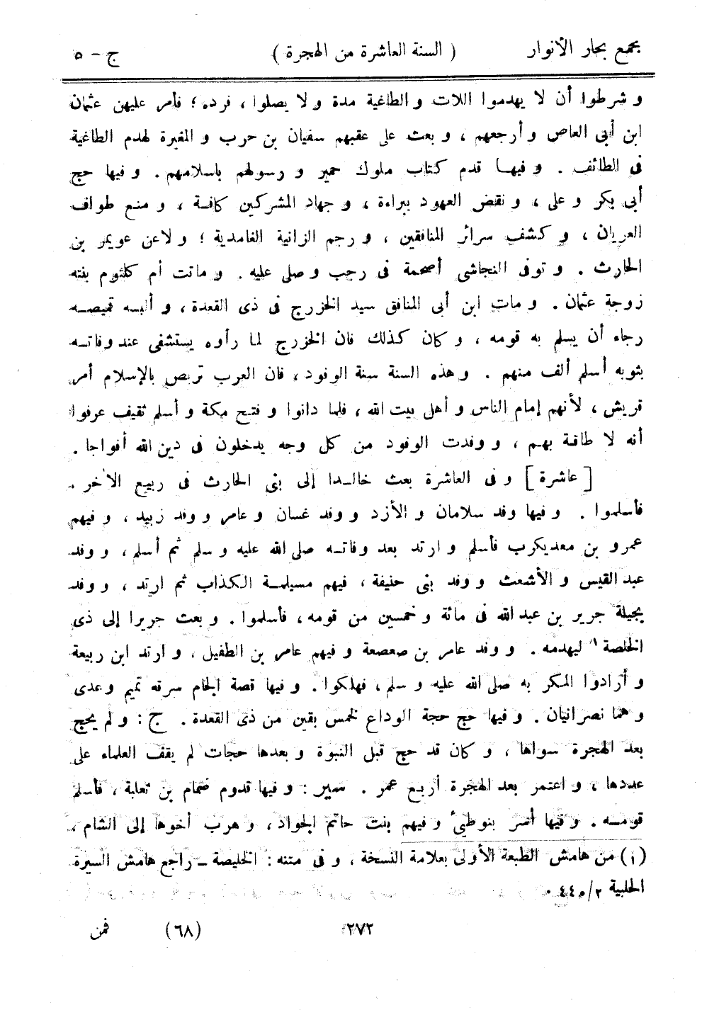 [عاشرة] وفي العاشرة بعث خالدًا على بني الحارث في ربيع الآخر، فأسلموا. وفيها وفد سلامان والأزد ووفد غسان وعامر ووفد زبيد، وفيهم عمرو بن معد يكرب فأسلم وارتد بعد وفاته صلى الله عليه وسلم ثم أسلم، ووفد عبد القيس والأشعث ووفد بني حنيفة، فيهم مسيلمة الكذاب ثم ارتد، ووفد بجيلة جرير بن عبد الله في مائة وخمسين من قومه، فأسلموا. وبعت جريرًا إلى ذي الخلصة ليهدمه. ووفد عامر بن صعصعة وفيهم عامر بن الطفيل، وارتد بان ربيعة وأرادوا المكر به صلى الله عليه وسلم، فهلوا. وفيها قصة الجام سرقه تميم وعدى وهما نصرانيان. وفيها حج حجة الوداع لخمس بقين من ذي القعدة. ج: ولم يحج بعد الهجرة سواها، وكان قد حج قبل النبوة وبعدها حجات لم يقف العلماء على عددها، واعتمر بعد الهجرة أربع عمر. سير: وفيها قدوم صمام بن ثعلبة، فأسلم قومه. وفيها أسر بنو طيء وفيهم بنت حاتم الجوادن وهرب أخوها إلى الشام،