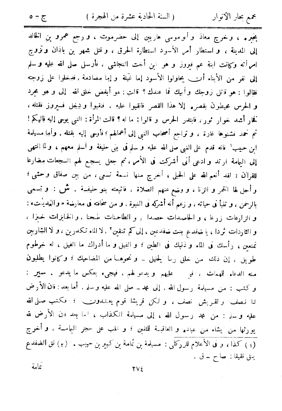 بخبره، وخرج معاذ وأبو موسى هاربين إلى حضرموت، ورجع عمرو بن الخالد إلى المدينة، واستطار أمر الأسود استطارة الحرق، وقتل شهر بن باذان وتزوج امرأته وكانت ابنة عم فيروز وهو ابن أخت النجاشي، فأرسل صلى الله عليه وسلم إلى نفر من الأبناء أن يحاولوا الأسود ما غيلة وإما مصادمة، فدخلوا على زوجته فقالوا: هو قاتل زوجك وأبيك فما عندك؟ قالت: هو أبغض خلق الله إلى وهو مجرد والحرس محيطون بقصره إلا هذا القصر فانقبوا عليه، فنقبوا ودخل فيروز فقتله، فخار أشد خوار ثور، فابتدر الحرس وقالوا: ما له؟ قالت المرأة النبي يوحي إليه فإليكم! ثم خمد فشنوها غارة، وتراجع أصحاب النبي إلى أعمالهم، فأوحى إليه بقتله. وأما مسيلمة ابن حبيب فنه قدم على النبي صلى الله عليه وسلم في بني حنيفة وأسلم معهم، ولما انتهى إلى اليمامة ارتد وادعى أني أشركت في الأمر، ثم جعل يسجع لهم السجعات مضارعًا للقرآن: لقد أنعم الل على الحبلى، أخرج منها نسمة نسعى، من بين صفاق وحشي، وأجل لها الخمر والزنا، ووضع عنهم الصلاة، فاتبعته بنو حنيفة. ش: وتسمى بالرحمن، وتنبأ في حياته، وزعم أنه أشركه في النبوة، ومن سخافته في معارضة "والهاديات": والزارعات زرعًا، والحاصدات حصدًا. والطاحنات طحنًا، والخابزات خبزًا، والثاردات ثردًا، يا ضفدع بنت ضفدعين، إلى كم تنقين، لا الماء تكدرين، ولا الشاربين تمنعين، رأسك في الماء وذنبك في الطين، والفيل وأما أدراك ما الفيل، له خرطوم طويل، إن ذلك من خلق ربنا لجليل - ونحوها من المضاحي؛ وكانوا يطلبون منه الدعاء للمهمات، فيبرك [؟] عليهم ويدعو لهم، فيجيء بعكس ما يدعو. سير: وكتب: من مسيلمة رسول الله، إلى محمد - صلى الله عليه وسلم. أما بعد: فإن الأرض لنا نصف ولقريش نصف، ولكن قريشًا قوم يعتدون، فكتب صلى الله عليه وسلم: من محمد رسول الله، إلى مسيلمة الكذاب، أما بعد فإن الأرض لله يورثها من يشاء من عباده والعاقبة للمتقين، وغلب على حجر اليمامة، وأخرج