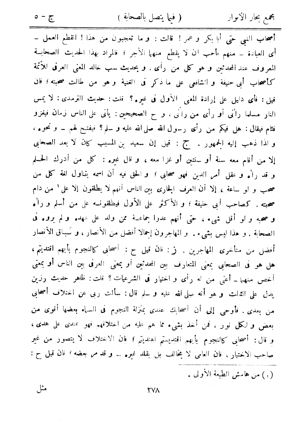 أصحاب النبي حتى أبا بكر وعمر! قالت: وما تعجبون من هذا! انقطع العمل - أي العبادة - منهم فأحب أن لا يقطع منهما الأجر؛ فالمراد بهذا الحديث الصحابة المعروف عند المحدثين وهو كل من رأى، وبحديث سب خالد المعنى العرفي للأئمة كأصحاب أبي حنيفة والشافعي على ما ذكر في الغنية وهو من طالت صحبته، فإن قيل: فأي دليل على إرادة المعنى الأول في غيره؟ قلت: حديث الترمذي: لا يمس النار مسلمًا رآني أو رأى من رآني، وح الصحيحين: يأتي على الناس زمان فيغزو فثام فيقال: هل فيكم من رأى رسول الله صلى الله عليه وسلم؟ فيفتح لهم- ونحوه، ولذا ذهب إليه الجمهور. ج: قيل إن سعيد بن المسيب كان لا يعد الصحابي إلا من أقام معه سنة أو سنتين أو غزا معه، وقال غيره: كل من أدرك الحلم وقد رآه وعقل أمر الدين فهو صحابي، والحق فيه أن اسمه يتناول لغة ل من صحب ولو ساعة، إلا أن العرف الجاري بين الناس أنهم لا يطلقون إلا على من دام صحبته، كصاحب أبي حنيفة، والأكثر على الأول فيطلقونه على من أسلم ورآه وصحبه ولو أقل شيء، حتى أنهم عدوا جماعة ممن ولد على عهده ولم يروه في الصحابة، وهذا ليس بشيء. والمهاجرون إجمالًا أفضل من الأنصار، وسباق الأنصار أفضل من متأخري المهاجرين. ز: فإن قيل ح: أصحابي كالنجوم بأيهم اقتديتم، هل هو في الصحابي بمعنى المتعارف بين المحدثين وبمعنى العرفي بين الناس أو بمعنى أخص منهما - أعين من له رأي واختيار في الشرعيات؟ قلت: ظاهر حديث رزين يدل على الثلث وهو أنه صلى الله عليه وسلم قال: سألت ربي عن اختلاف أصحابي من بعدي، فأوحى على أن أصحابك عندي بمنزلة النجوم في السماء بعضها أقوى من بعض ولكل نور، فمن أخذ بشيء مما هم عليه من اختلافهم فهو عندي على هدى، وقال: أصحابي كالنجوم بأيهم اقتديتم اهتديتم، فإن الاختلاف لا يتصور من غير صاحب الاختيار، فإن العامي لا يخالف بل يقلد غيره - وقد مر بعضه، فإن قيل ح: