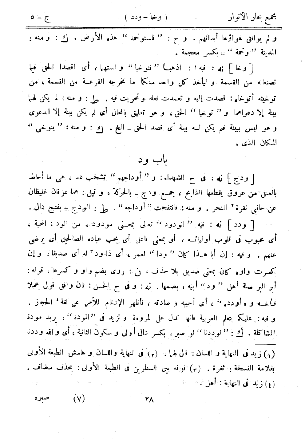 [ودد] نه: فيه "الودود" تعالى بمعنى مودود، من الود: المحبة، أي محبوب في قلوب أوليائه، أو بمعنى فاعل أي يحب عباده الصالحين أي يرضى عنهم. وفيه: إن أبا هذا كان "ودا" لعمر، أي ذا ود له أي صديقًا، وإن كسرت واوه كان بمعنى صديق بلا حذف. ن: روى بضم واو وكسرها، قوله: أبر البر صلة أهل "ود" أبيه، بضمها. نه: وفي ح الحسن: فإن وافق قول عملًا فأخاه و"أودده"، أي أحببه وصادقه، فأظهر الإدغام للآمر على لغة الحجاز. وفيه: عليكم يتعلم العربية فإنها تدل على المروءة وتزيد في "المودة"، يريد مودة المشاكلة. ك: "لوددنا" لو صبر، بكسر دال أولى وسكون الثانية، أي والله وددنا