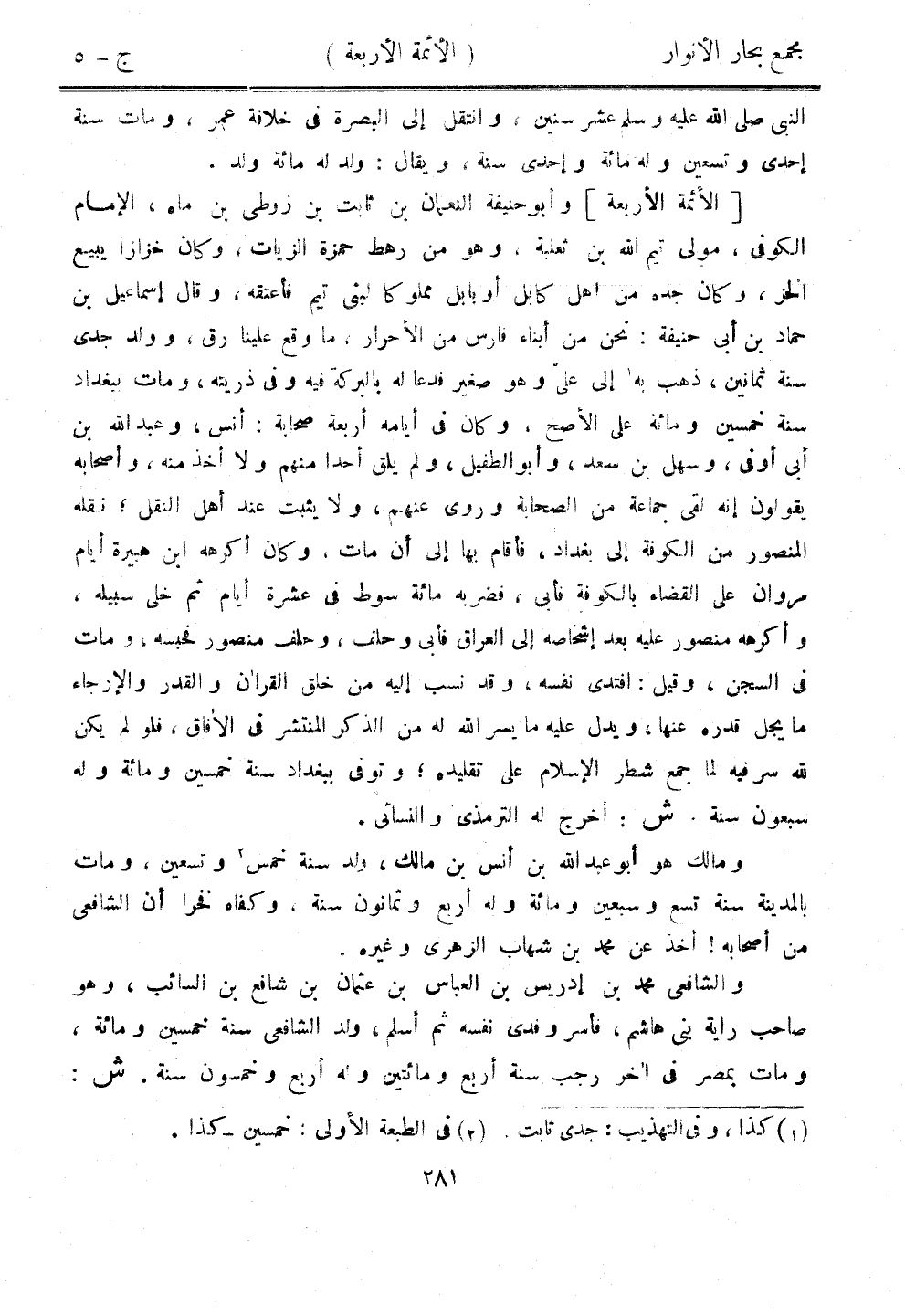 وأبو حنيفة النعمان بن ثابت بن زوطي بن ماه، الإمام الكوفي، مولى تيم الله بن ثعلبة، وهو من رهط حمزة الزيات، وكان خزازًا يبيع الخز، وكان جده من أهل كابل أو بابل مملوكًا لبني تيم فأعتقه، وقال إسماعيل بن حماد بن أبي حنيفة: نحن من أبناء فارس من الأحرار، ما وقع علينا رق، وولد جدي سنة ثمانين، ذهب به إلى عليّ وهو صغير فدعا له بالبركة فيه وفي ذريتهن ومات ببغداد سنة خمسين ومائة على الأصح، وكان في أيامه أربعة صحابة أنس، وعبد الله بن أبي أوفىن وسهل بن سعد، وأبو الطفيل، ولم يلق أحدًا منهم ولا أخذ منه، وأصحابه يقولون إنه لقي جماعة من الصحابة وروى عنهم، ولا يثبت عند أهل النقل، نقله المنصور من الكوفة إلى بغداد، فأقام بها إلى أن مات، وكان أكرهه ابن هبيرة أيام مروان على القضاء بالكوفة فأبى، فضربه مائة سوط في عشرة أيام ثم خلى سبيله، وأكرهه منصور عليه بعد إشخاصه إلى العراق فابى وحلف، وحلف منصور فحبسه، ومات في السجن، وقيل: افتدى نفسه، وقد نسب إليه من خلق القرآن والقدر والإرجاء ما يجل قدره عنها، ويدل عليه ما يسر الله له من الذكر المنتشر في الأفاق، فلو لم يكن لله سر فيه لما جمع شطر الإسلام على تقليده، وتوفى ببغداد سنة خمسين ومائة وله سبعون سنة. ش: اخرج له الترمذي والنسائي.