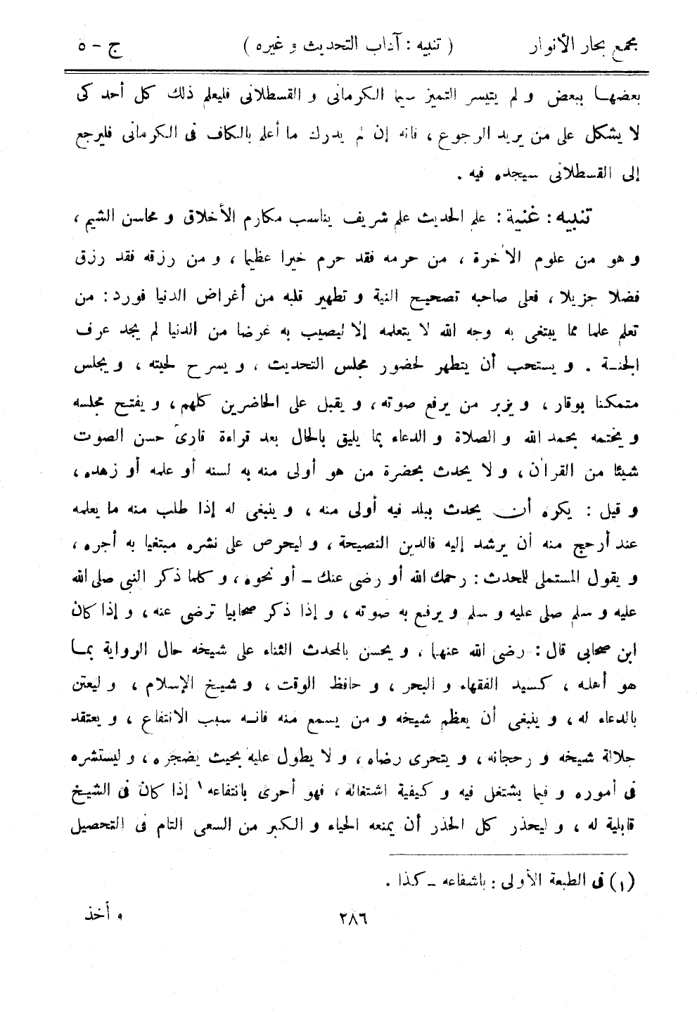 تنبيه: غنية: علم الحديث علم شريف يناسب مكارم الأخلاق ومحاسن الشيم، وهو من علوم الآخرة، من حرمه فقد حرم خيرًا عظيمًا، ومن رزقه فقد رزق فضلًا جزيلًا، فعلى صاحبه تصحيح النية وتطهير قلبه من أغراض الدنيا فورد: من تعلم علمًا مما يبتغي به وجه الله لا يتعلمه إلا ليصيب به غرضًا من الدنيا لم يجد عرف الجنة. ويستحب أن يتطهر لحضور مجلس التحديث، ويسرح لحيته، ويجلس متمكنًا بوقار، ويزبر من يرفع صوته، ويقبل على الحاضرين كلهم، ويفتح مجلسه ويختمه بحمد الله والصلاة والدعاء بما يليق بالحال بعد قراءة قارئ حسن الصوت شيئًا من القرآن، ولا يحدث بحضرة من هو أولى منه به لسنه أو علمه أو زهده، وقيل: يكره أن يحدث ببلد فيه أولى منه، وينبغي له إذا طلب منه ما يعلمه عند أرجح منه أن يرشد إليه فالدين النصيحة، وليحرص على نشره مبتغيًا به أجره، ويقول المستملي للمحدث: رحمك الله أو رضي عنك - أو نحوهن وكلما ذكر النبي صلى الله عليه وسلم ويرفع به صوته، وإذا ذكر صحابيًا ترضى عنه، وإذا كان ابن صحابي قال: رضي الله عنهما، ويحسن بالمحدث الثناء على شيخه حال الرواية بما هو أهله، كسيد الفقهاء والبحر، وحاف الوقت، وشيخ الإسلام، وليعتن بالدعاء له، وينبغي أن يعظم شيخه ومن يسمع منه فإنه سبب الانتفاع، ويعتقد جلالة شيخه ورجحانه، ويتحرى رضاه، ولا يطول عليه بحيث يضجره، وليستشره في أموره وفيما يشتغل فيه وكيفية اشتغاله، فهو أحرى بانتفاعه إذا كان في الشيخ قابلية له، وليحذر كل الحذر أن يمنعه الحياء والكبر من السعي التام في التحصيل